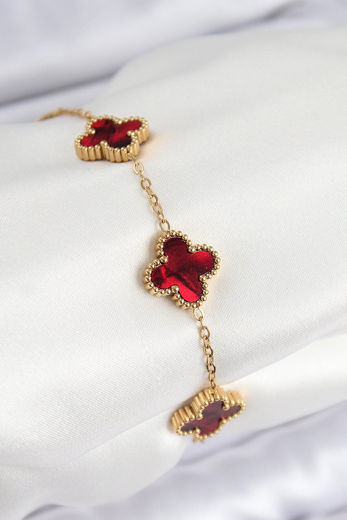 316L Çelik Sedefli Kırmızı Gold Renk Yonca Kadın Bileklik