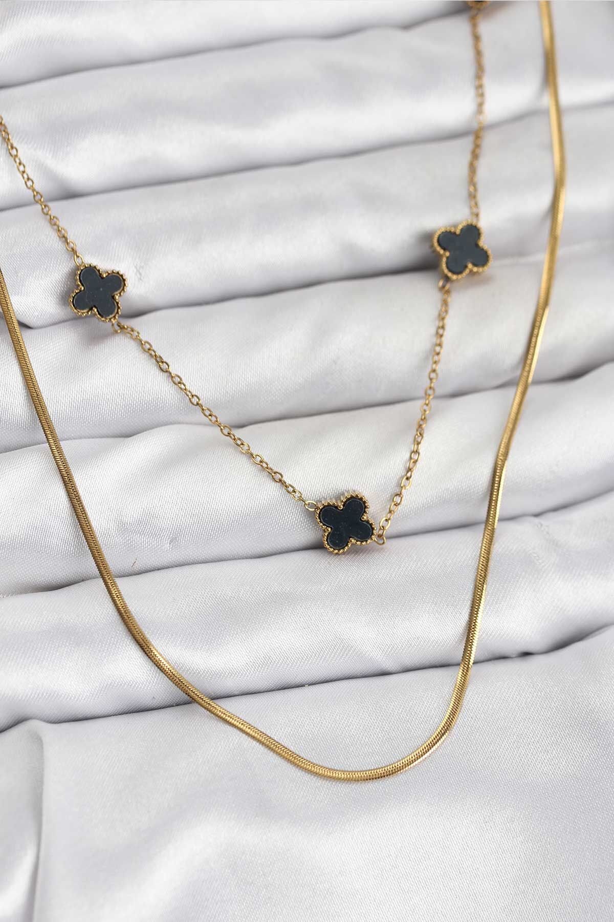 316L Çelik Zincir Gold Renk İtalyan Zincirli Siyah Yonca Model Kadın Kolye