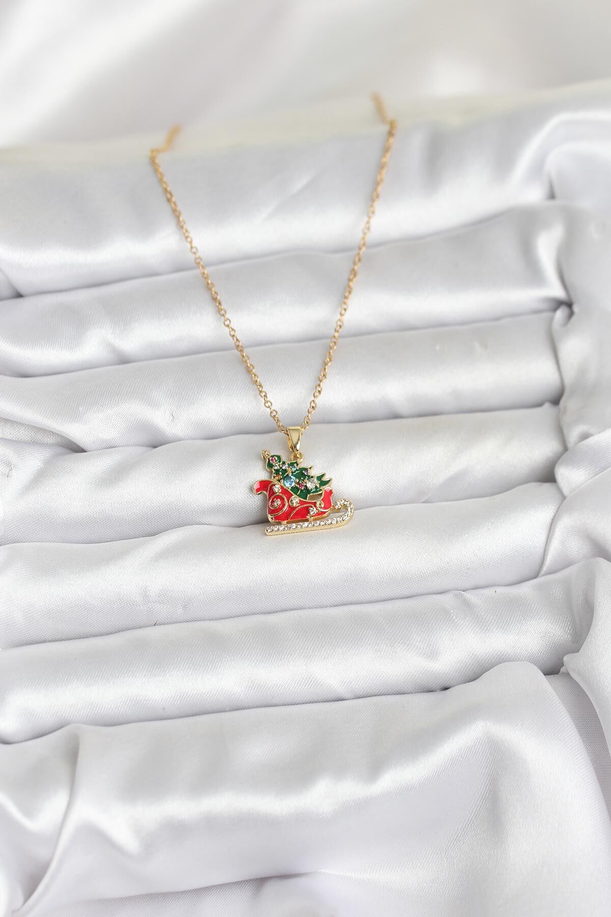 316L Çelik Zincir Gold Renk Kızak ve Çam Ağacı Figürlü Yılbaşı Temalı Kadın Kolye