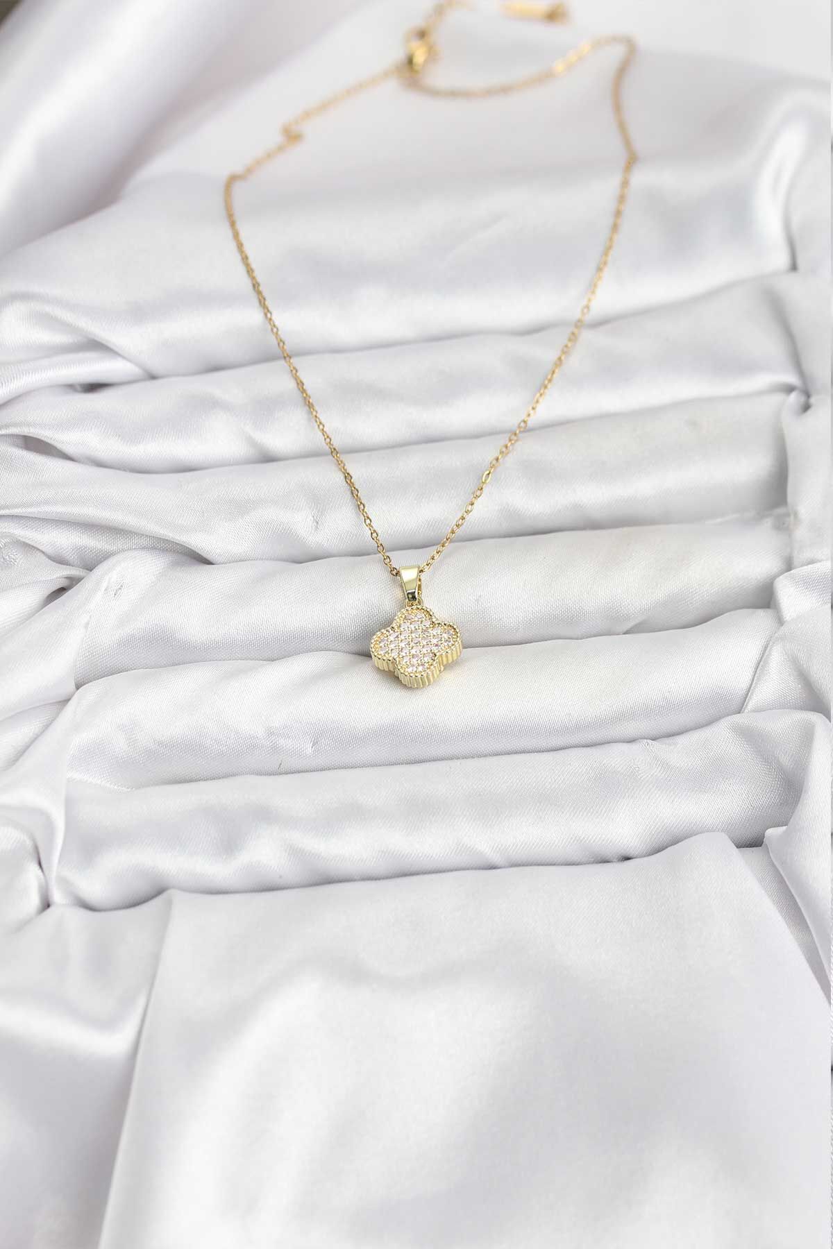 316L Çelik Zincir Gold Renk Zirkon Taşlı Yonca Model Kadın Kolye e_BKO10771
