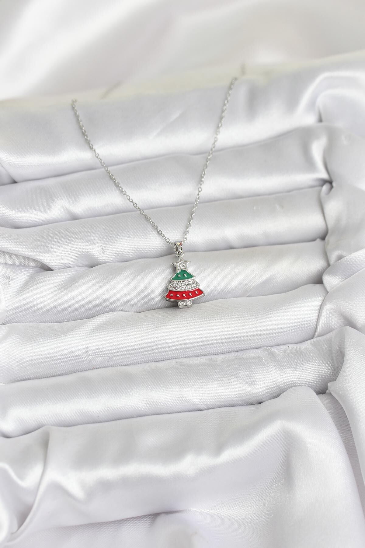 316L Çelik Zincir Gümüş Ren Çam Ağacı Model Zirkon Taşlı Yılbaşı Temalı Kadın Kolye