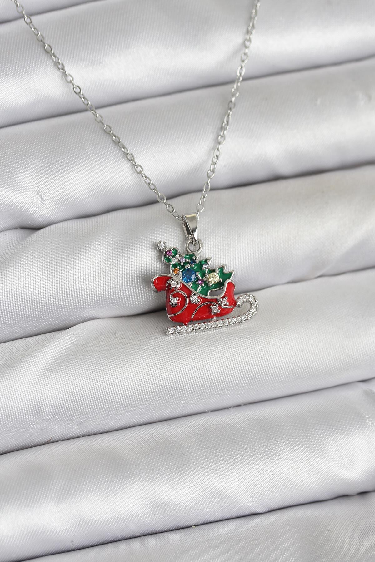 316L Çelik Zincir Gümüş Renk Kızak ve Çam Ağacı Figürlü Yılbaşı Temalı Kadın Kolye
