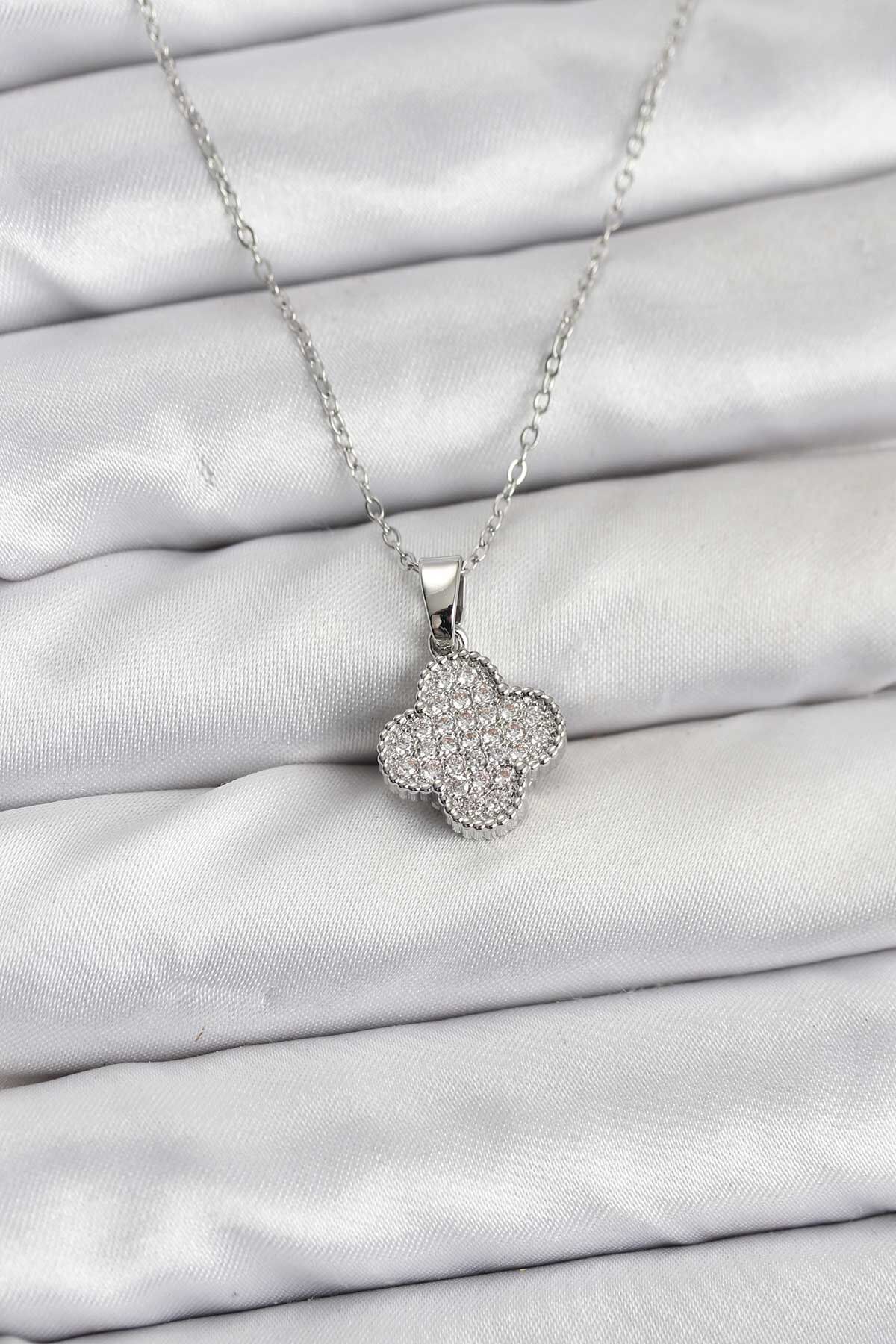 316L Çelik Zincir Gümüş Renk Zirkon Taşlı Yonca Model Kadın Kolye