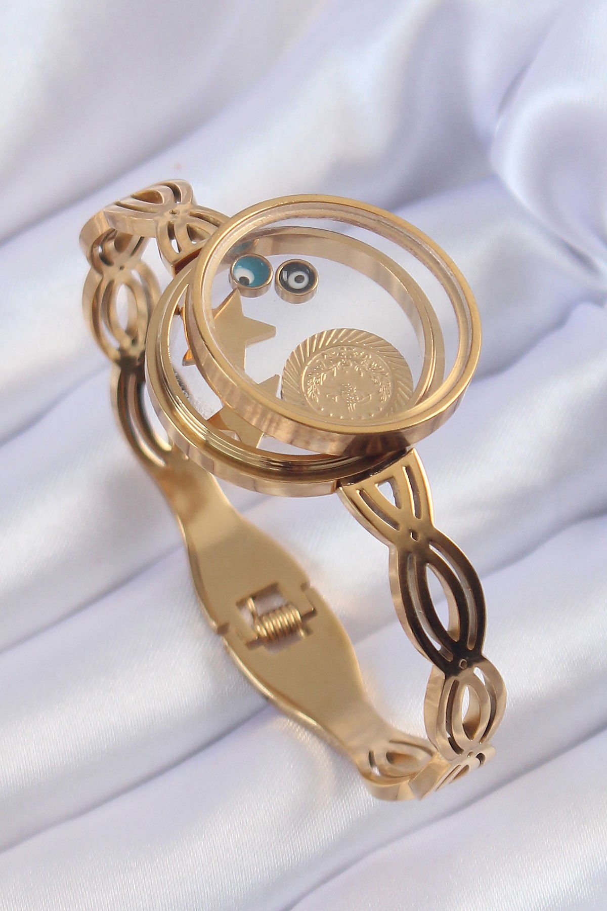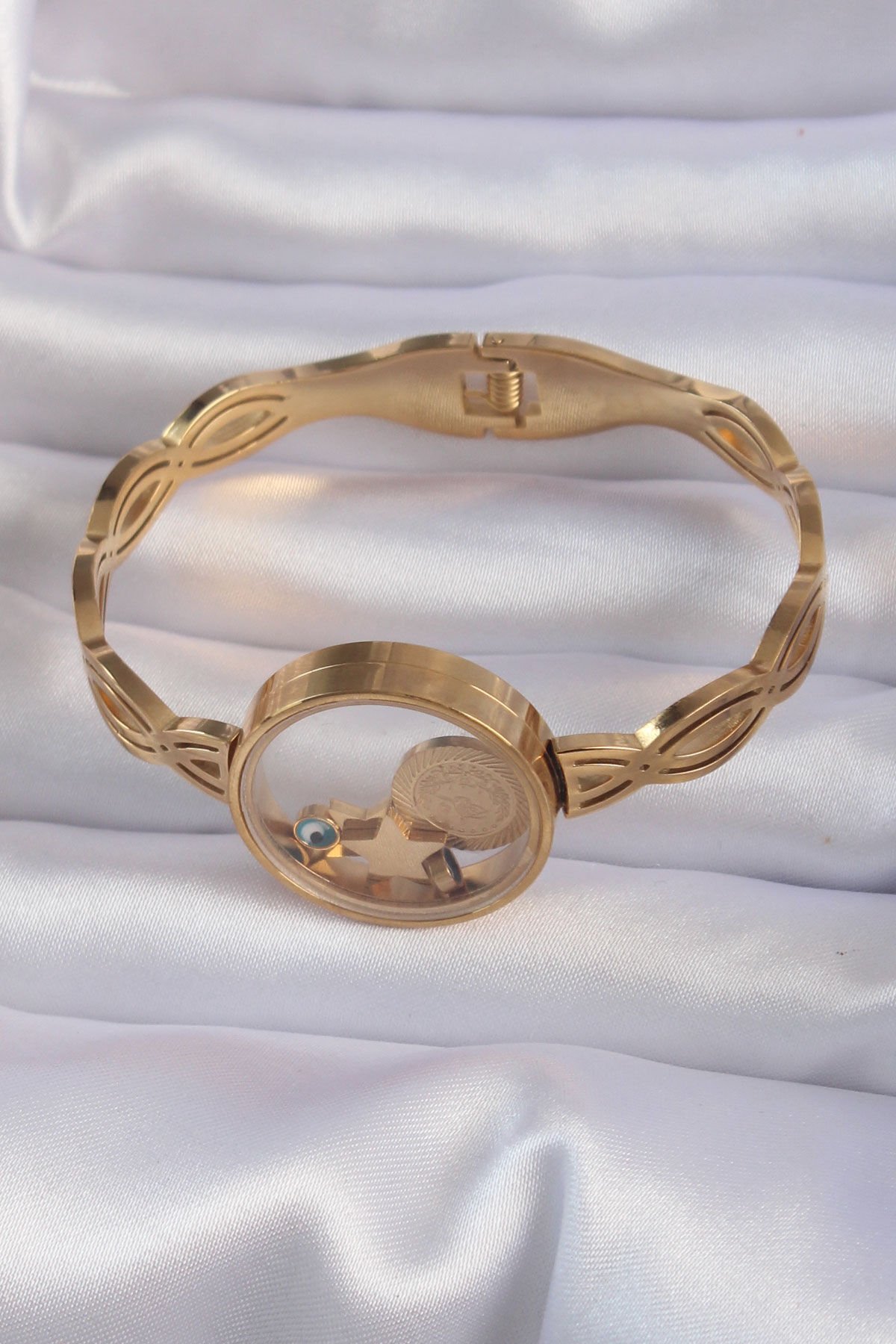 316L Çelik Altın Renk İçi Nazar Boncuk ve Yıldız Figürlü Açılabilir Fanus Kelepçe