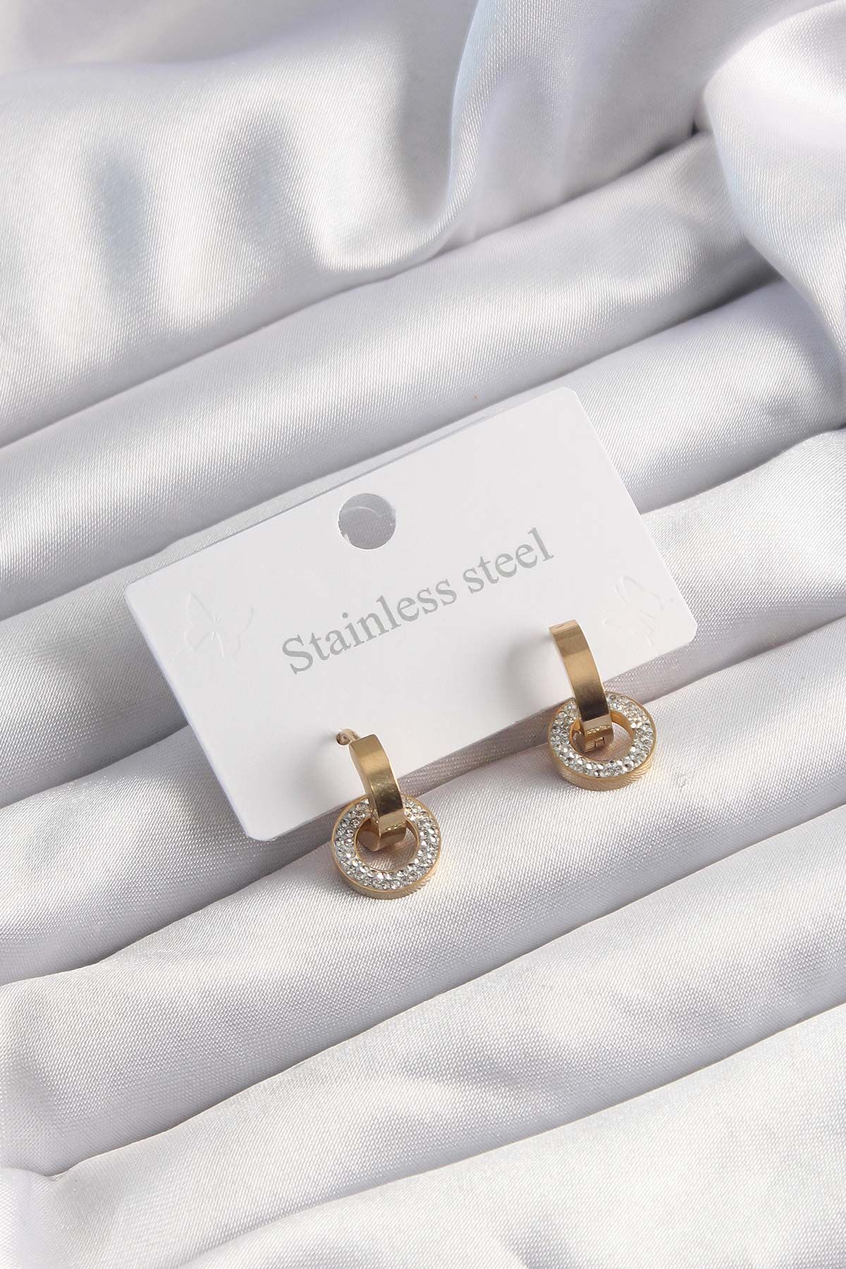 316L Çelik Altın Renk Zirkon Taşlı Halka Model Küpe e_BKP9499