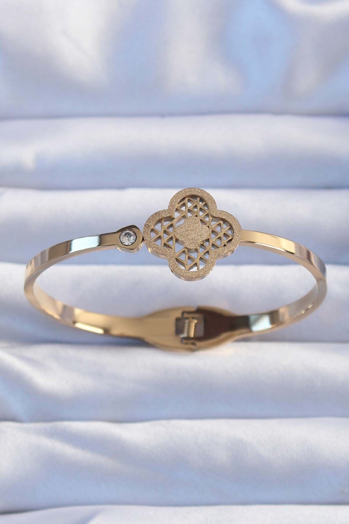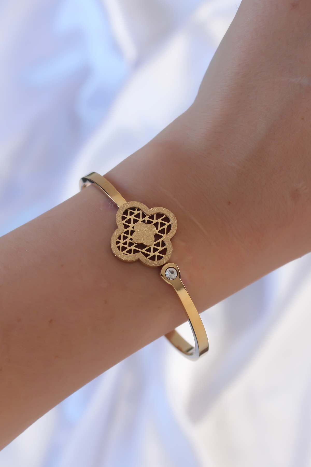316L Çelik Altın Renk Zirkon Taşlı Simli Yonca Kelepçe e_BB6377
