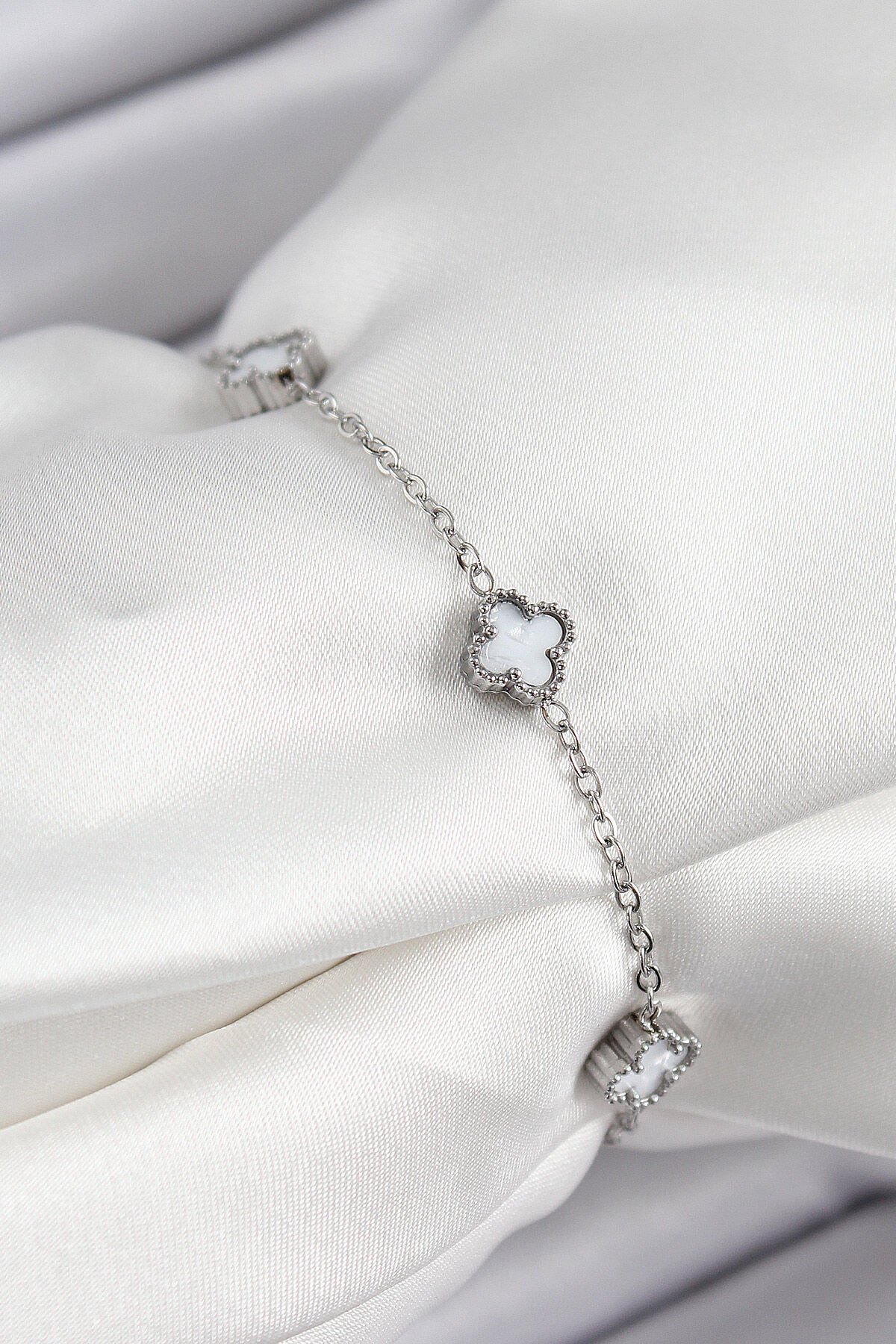 316L Çelik Beyaz Sedef Yonca Model Gümüş Renk Kadın Bileklik e_BB7361