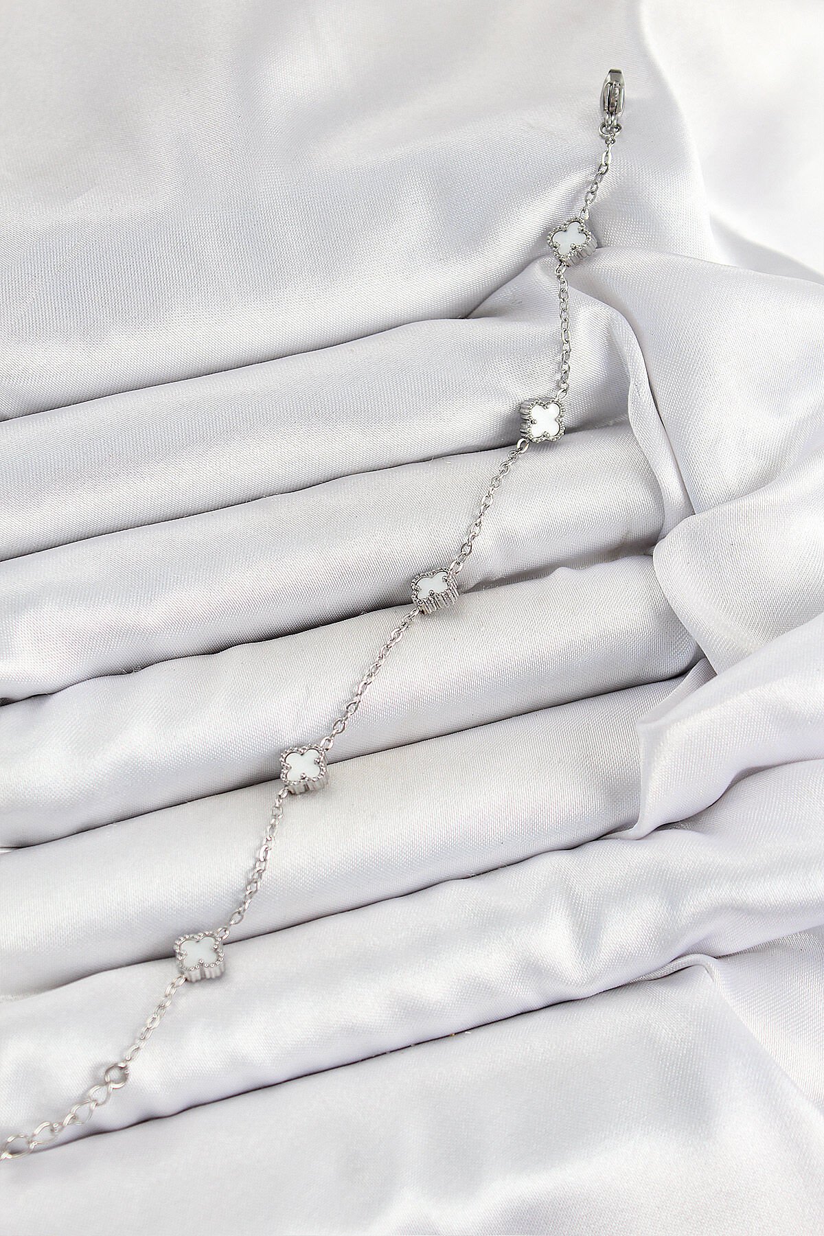 316L Çelik Beyaz Sedef Yonca Model Gümüş Renk Kadın Bileklik