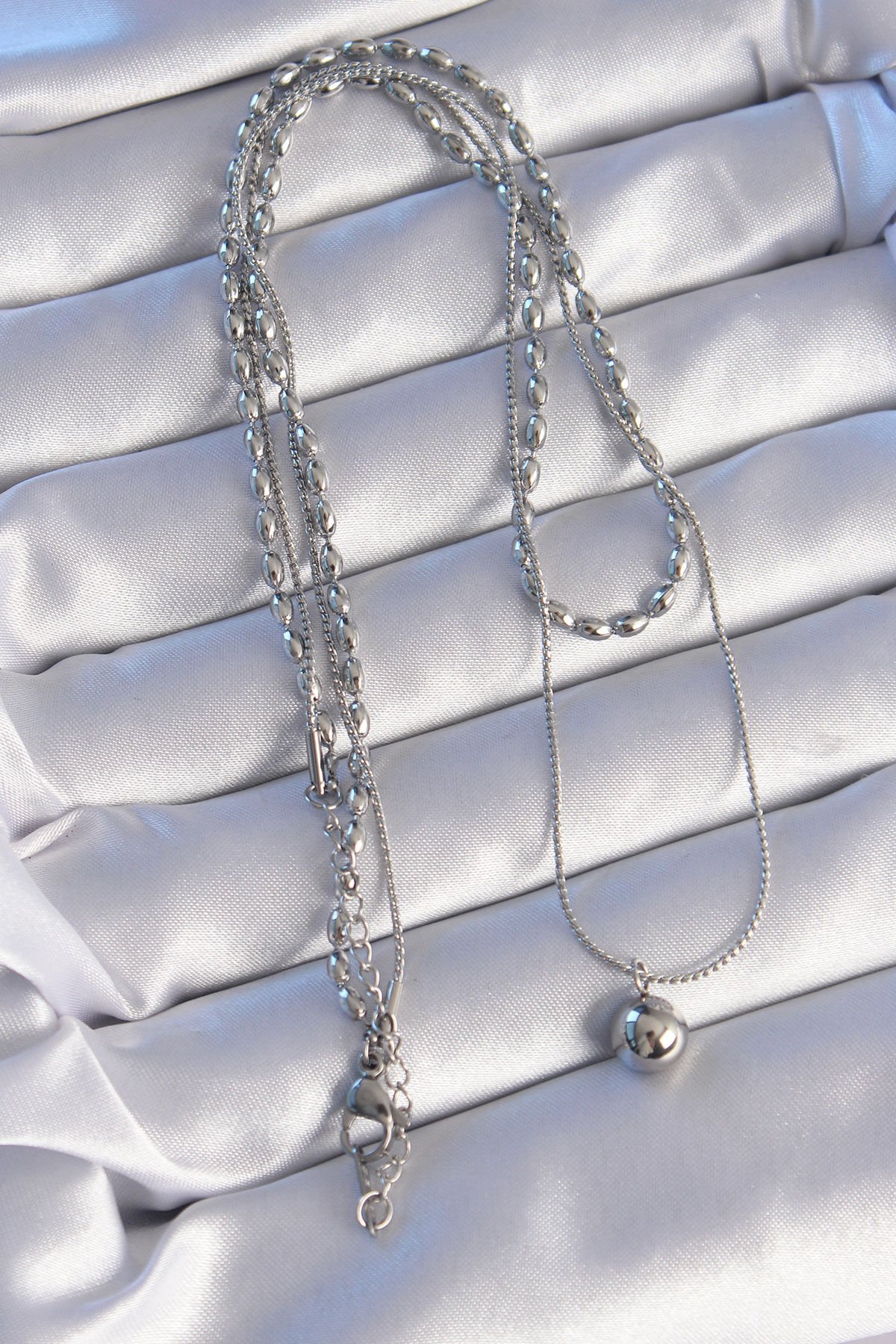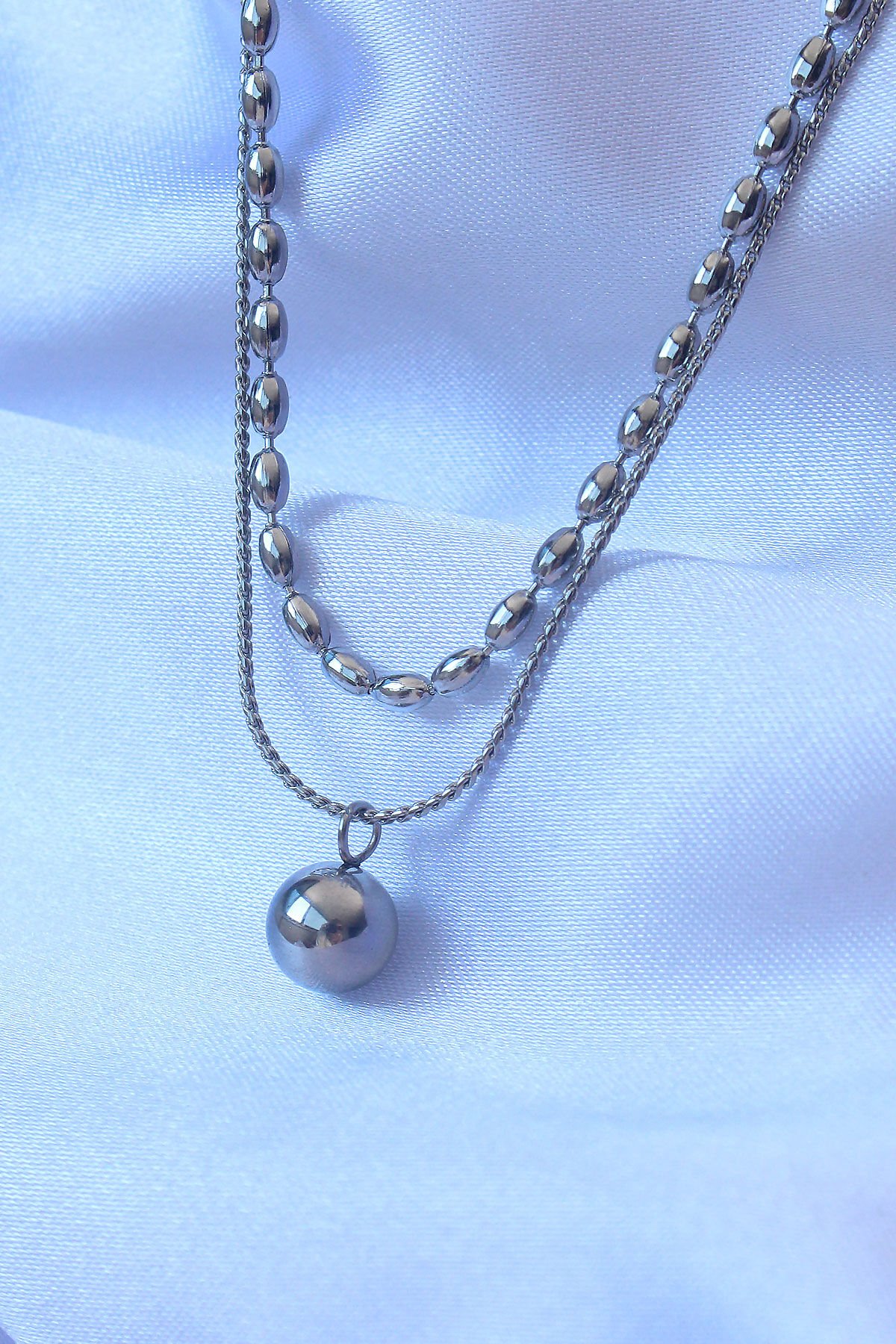 316L Çelik Çift Zincirli Gümüş Renk Topçuk Model Kolye