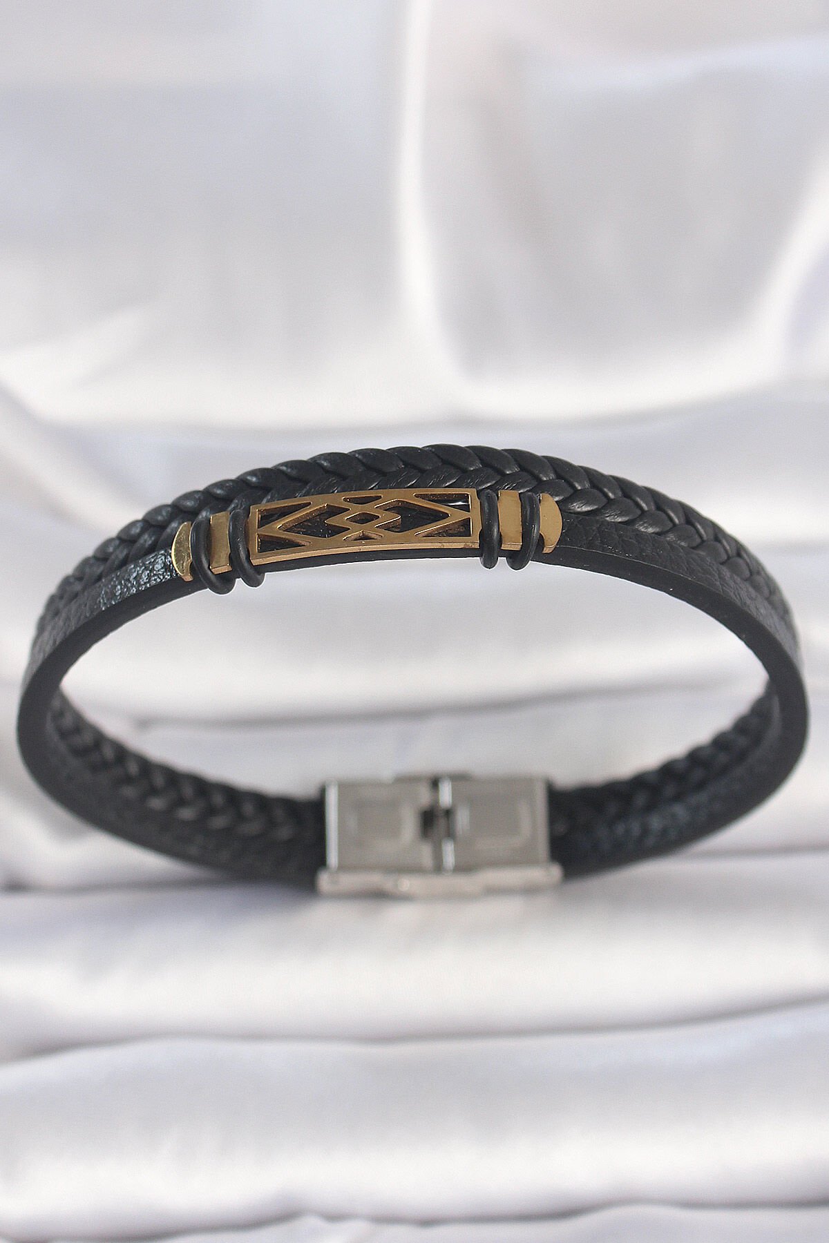 316L Çelik Gold Renk Aksesuarlı Çift Sıra Siyah Burgu Desenli Deri Kordon Erkek Bileklik
