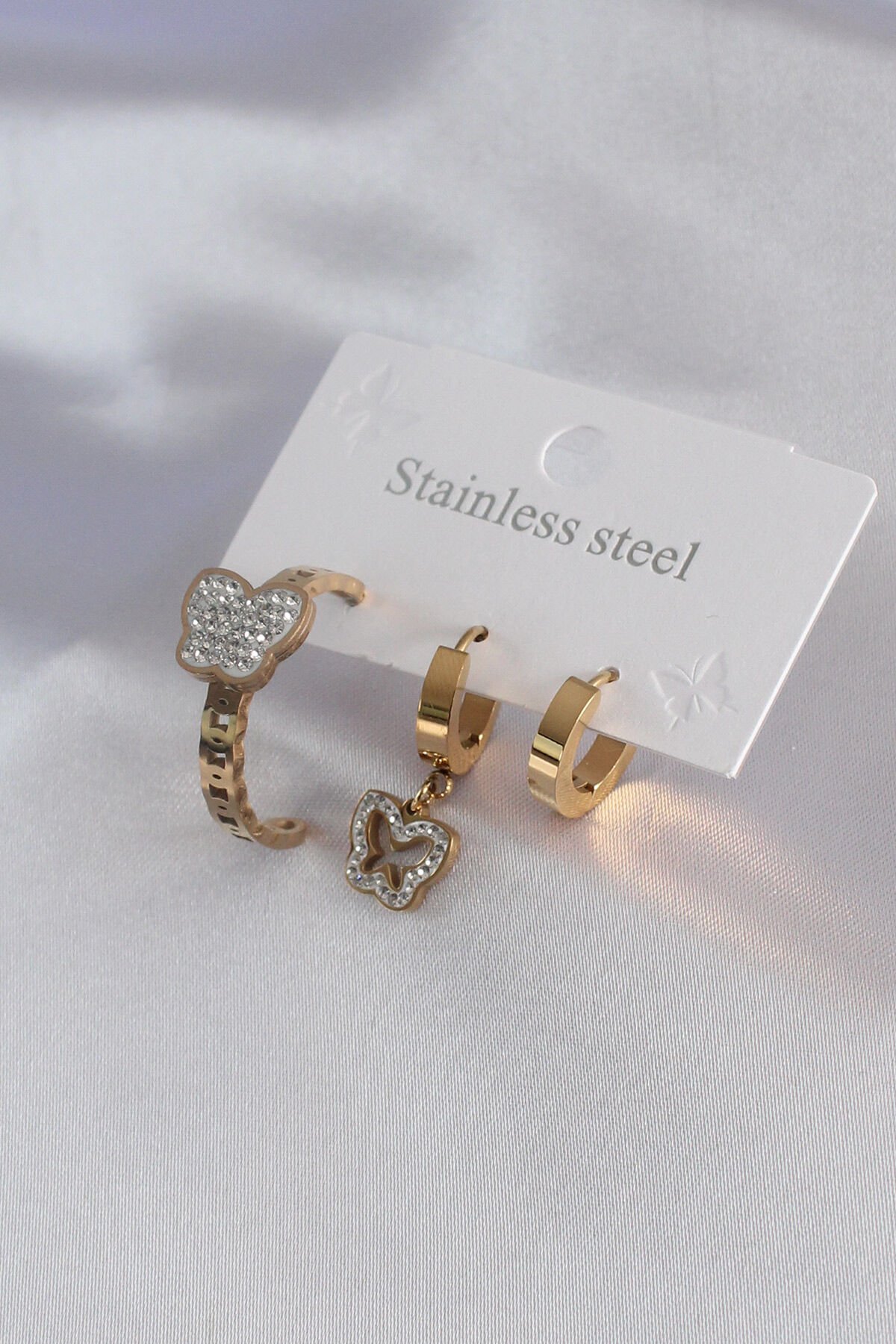 316L Çelik Gold Renk Kelebek Model Zirkon Taş Detay Kadın Küpe Kombini