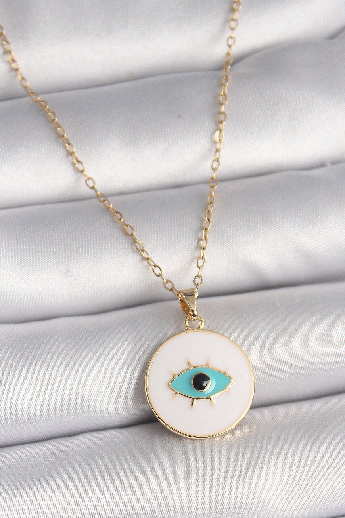 316L Çelik Gold Renk Zincir Beyaz Mineli Turkuaz Göz İşleme Model Kadın Kolye