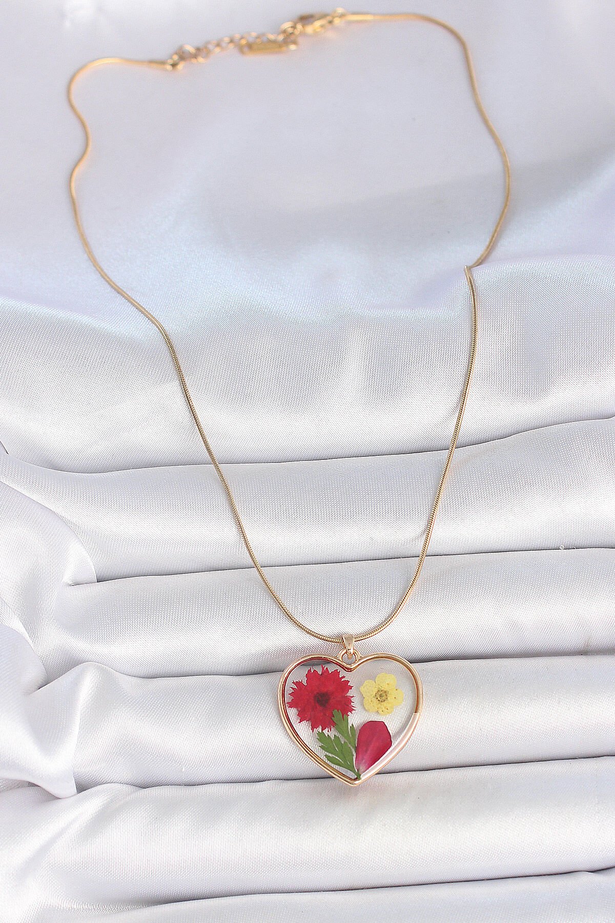 316L Çelik Gold Renk Zincir Epokis Kalp Doğal Çiçek Model Kadın Kolye
