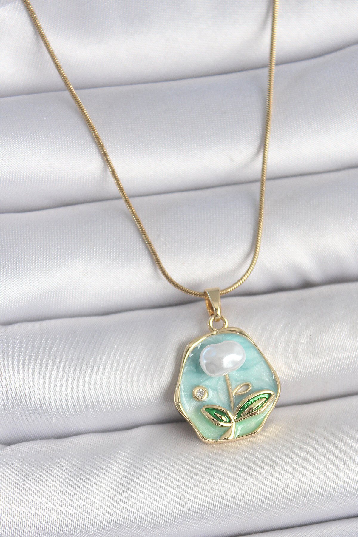 316L Çelik Gold Renk Zincir Mavi Çiçek İşlemeli İnci İşlemeli Portre Model Kadın Kolye