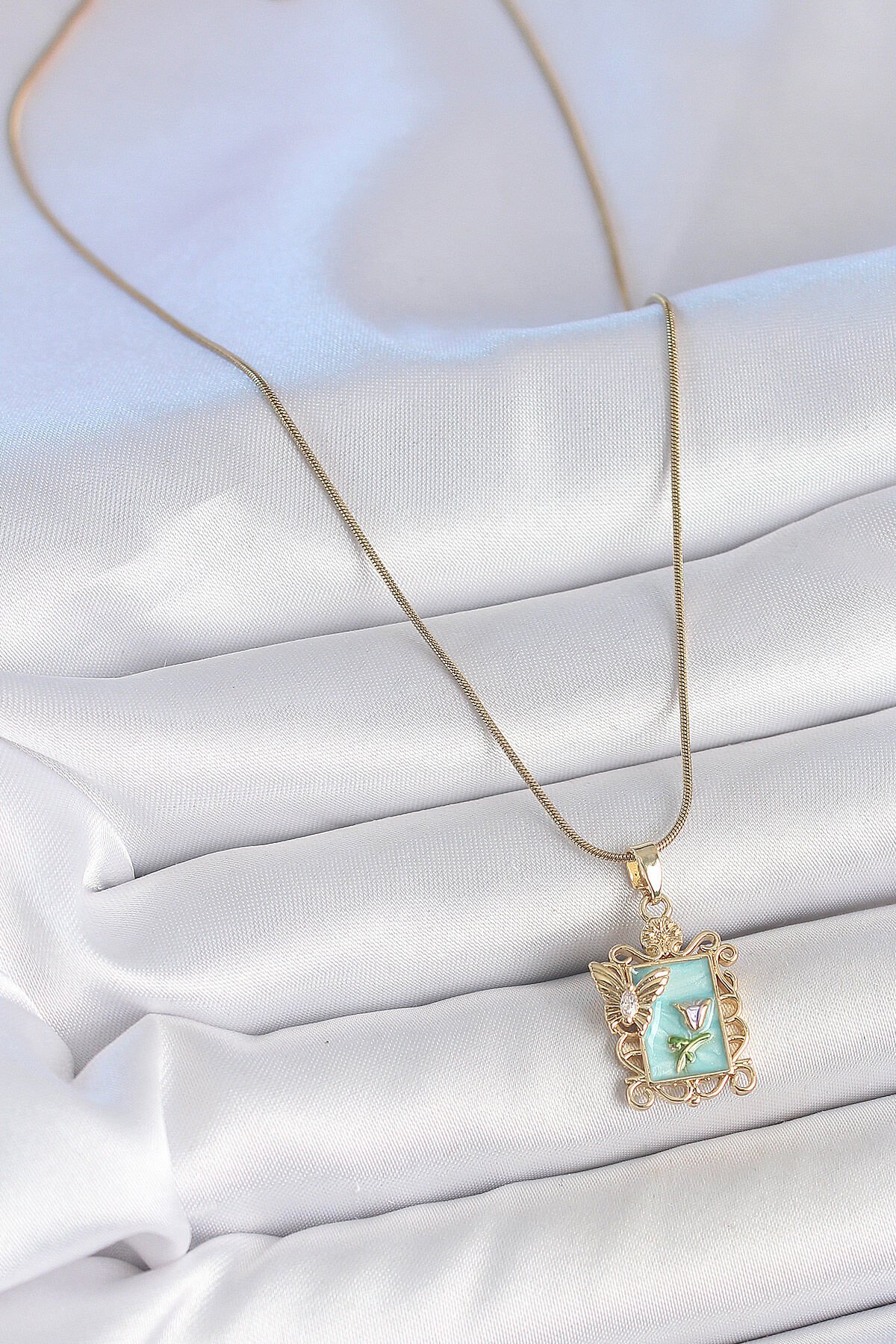 316L Çelik Gold Renk Zincir Mavi Mineli Çiçek İşlemeli Zirkon Taşlı Kelebek Detay Portre Model Kadın Kolye