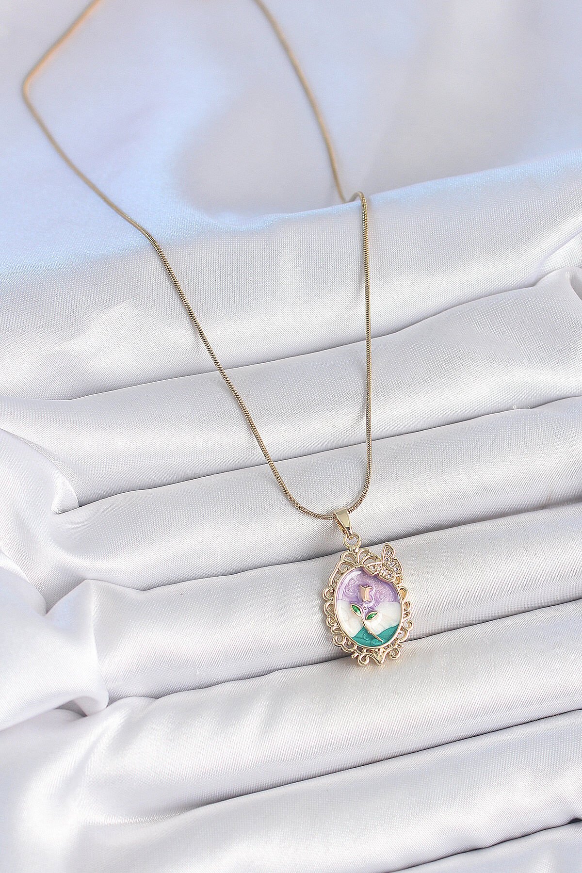 316L Çelik Gold Renk Zincir Mix Renk Mineli Çiçek İşlemeli Zirkon Taş Detaylı Portre Model Kadın Kolye