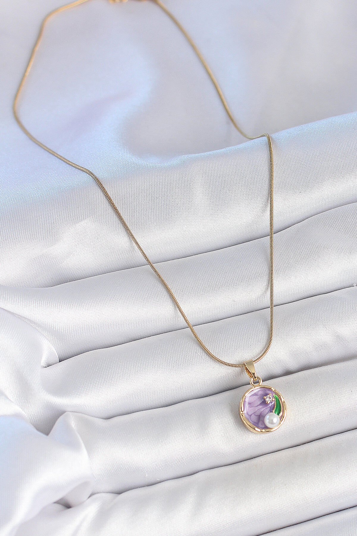 316L Çelik Gold Renk Zincir Mor Çiçek İşlemeli Zirkon Taş İnci Detaylı Minimal Portre Model Kadın Kolye