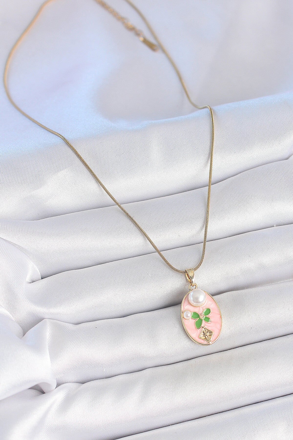 316L Çelik Gold Renk Zincir Pembe Mineli Oval İncili Çiçek İşlemeli Portre Model Kadın Kolye