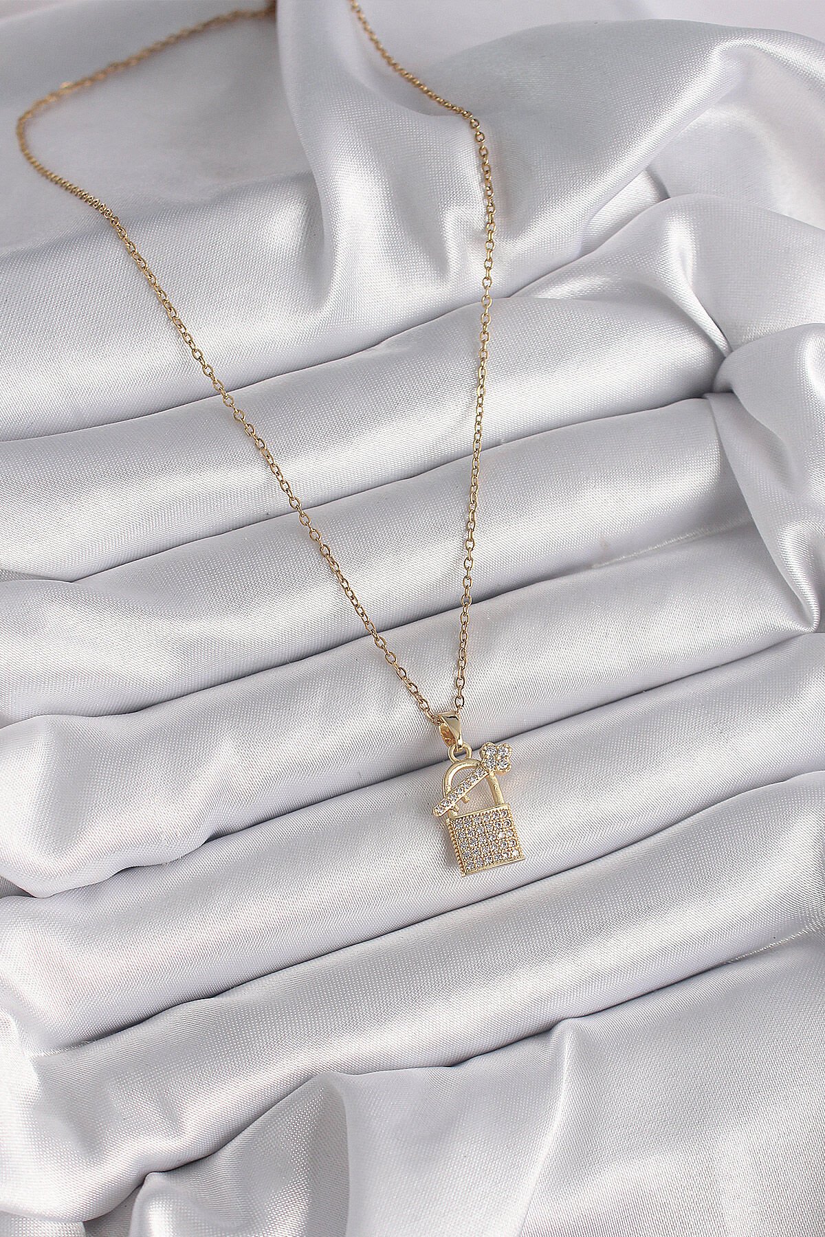 316L Çelik Gold Renk Zincir Zirkon Taşlı Asma Kilit Anahtar Model Kadın Kolye