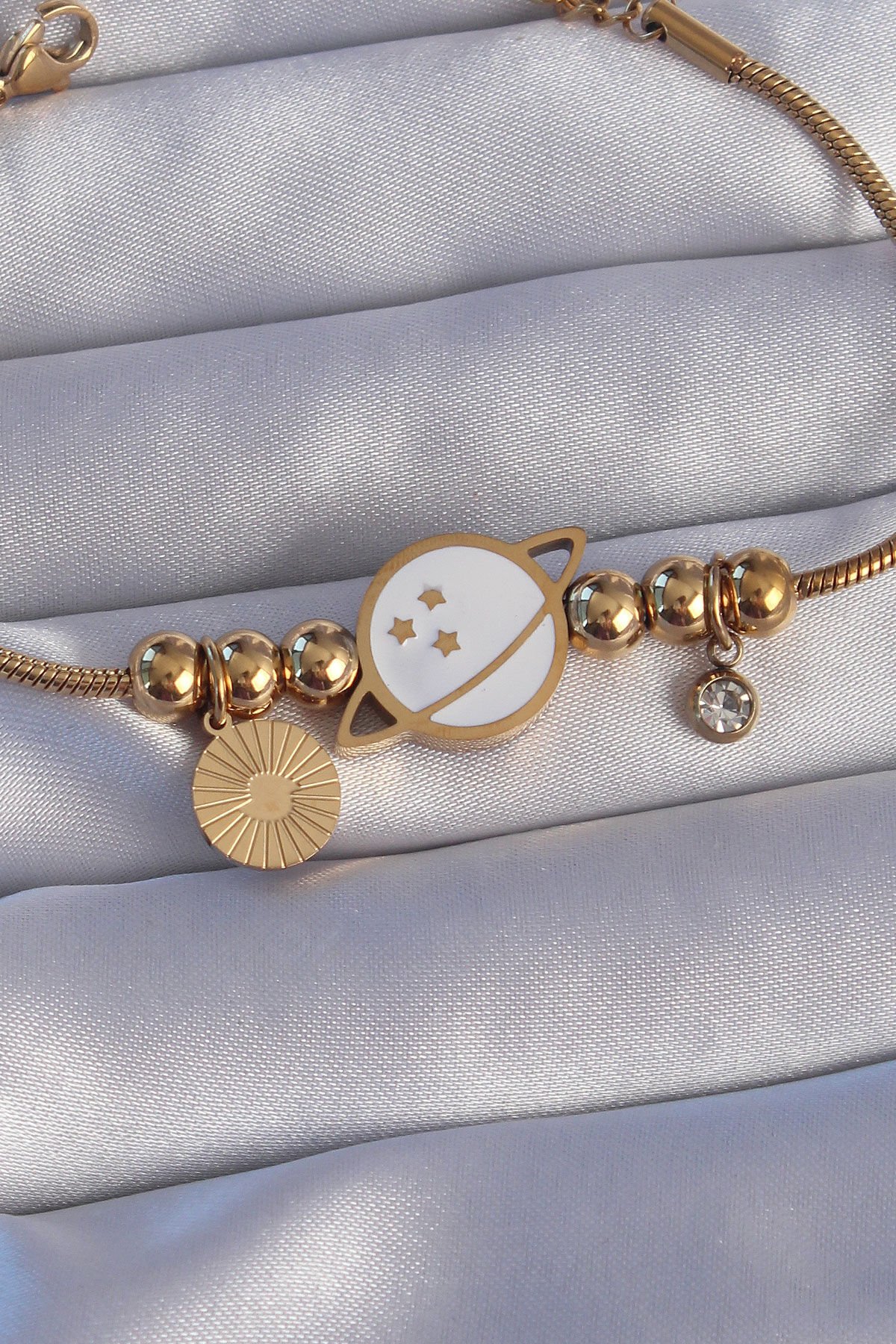 316L Çelik Gold Renk Zirkon Taşlı Mineli Satürn Tasarımlı Bileklik