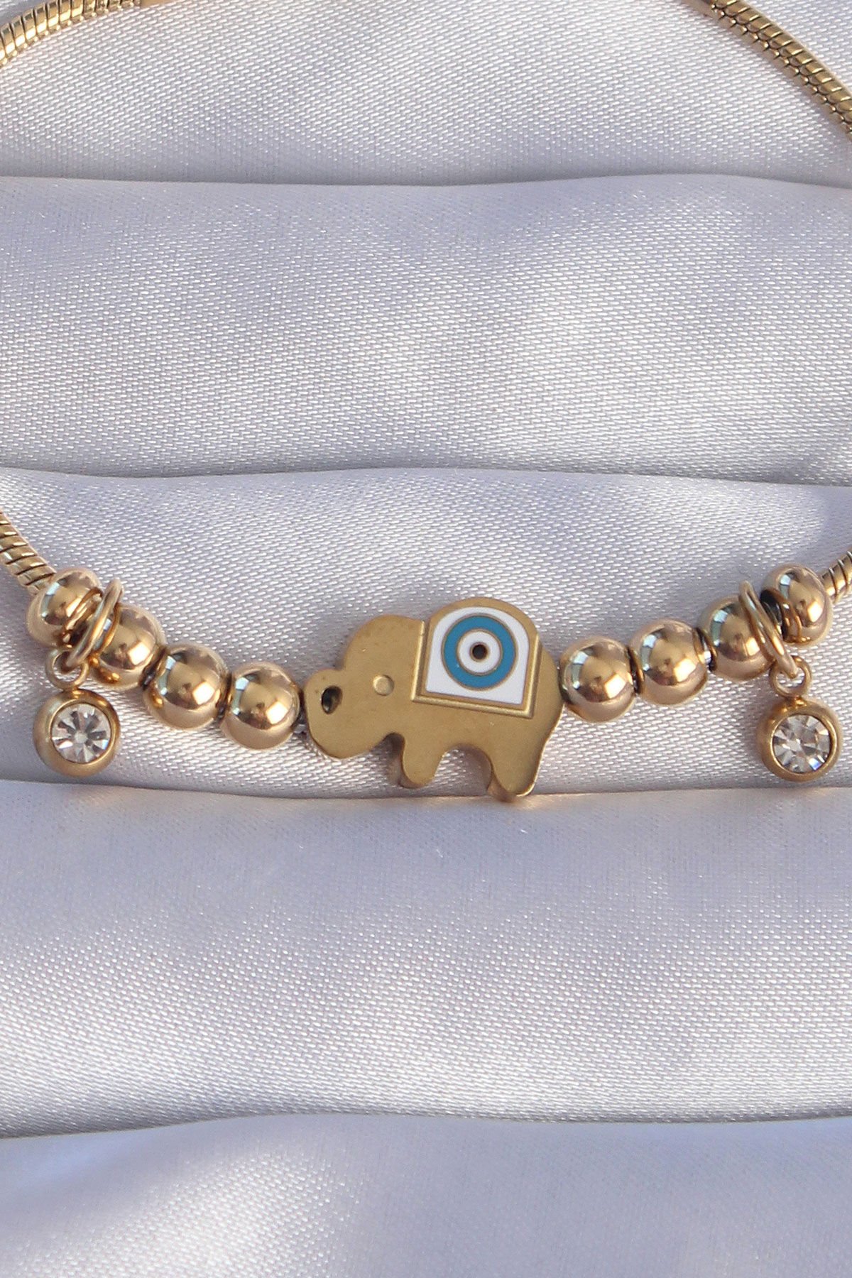316L Çelik Gold Renk Zirkon Taşlı Nazarlı Fil Tasarımlı Bileklik