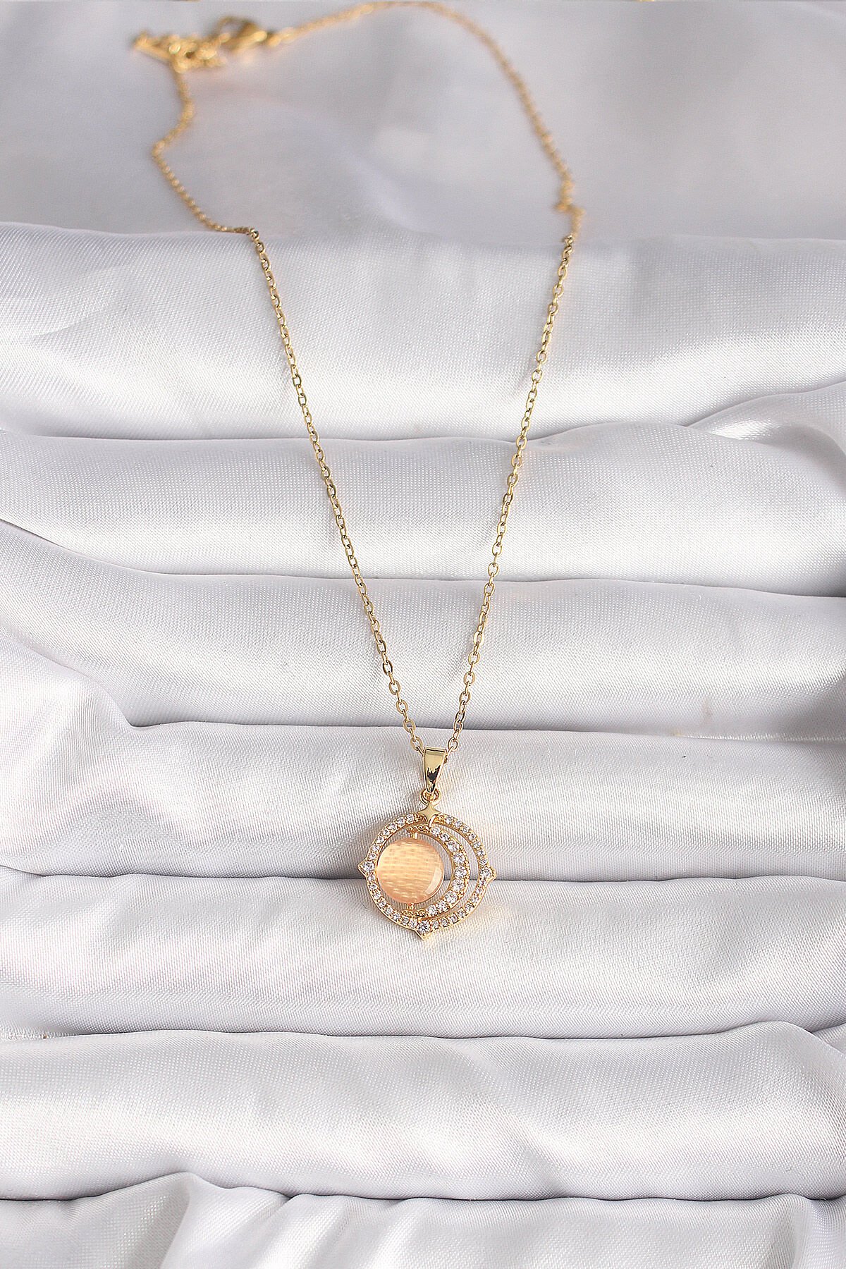 316L Çelik Gold Renk Zirkon Taşlı Turuncu Sedefli Hilal Model Kadın Kolye