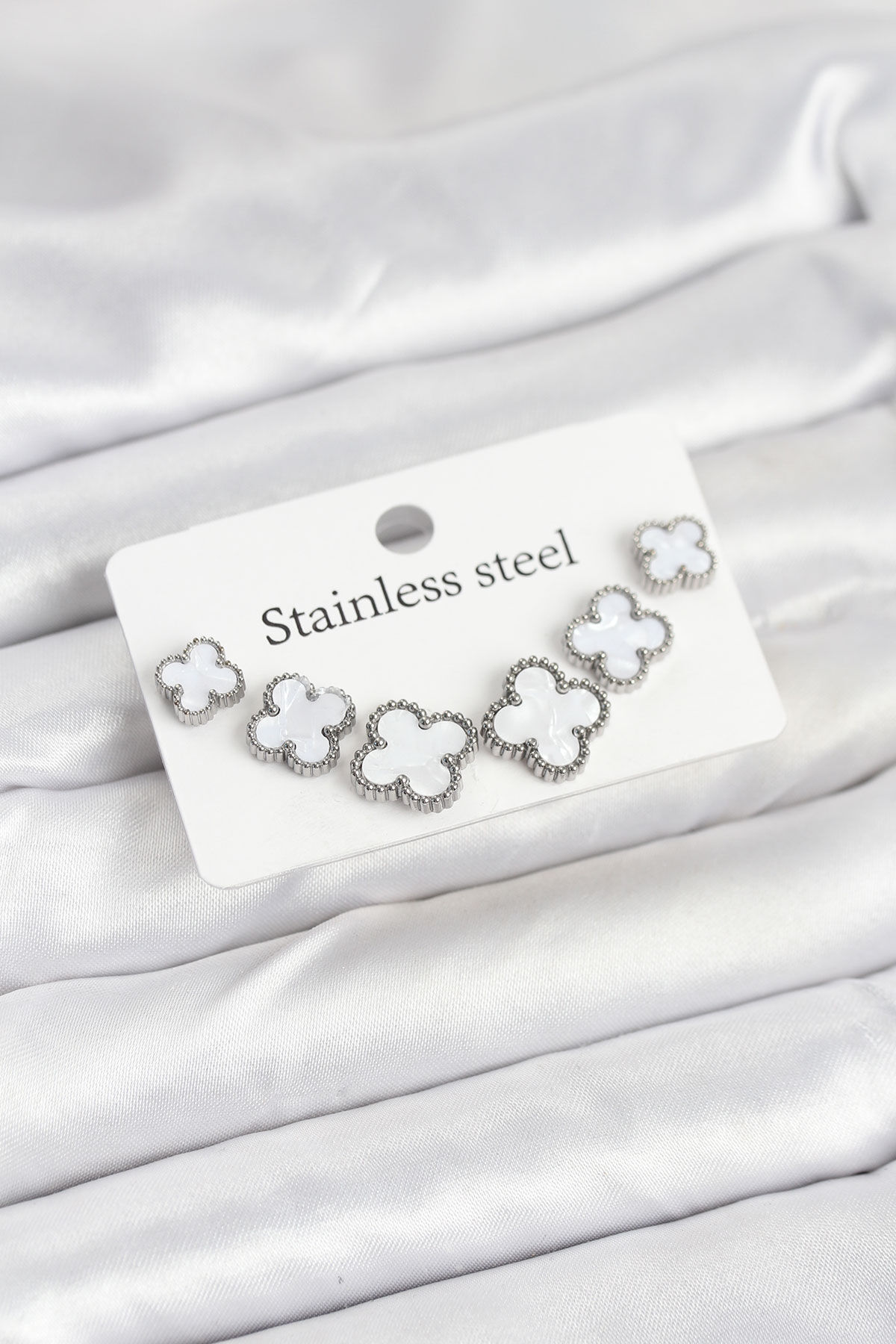 316L Çelik Gümüş Beyaz Renk 3 Boy Yonca Küpe Seti