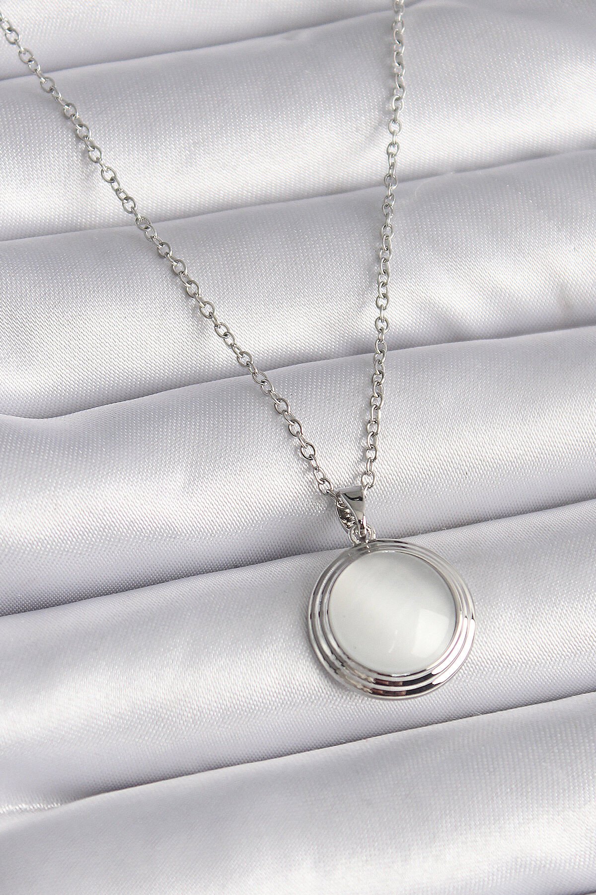 316L Çelik Gümüş Renk Beyaz Sedefli Daire Model Kadın Kolye e_BKO9426