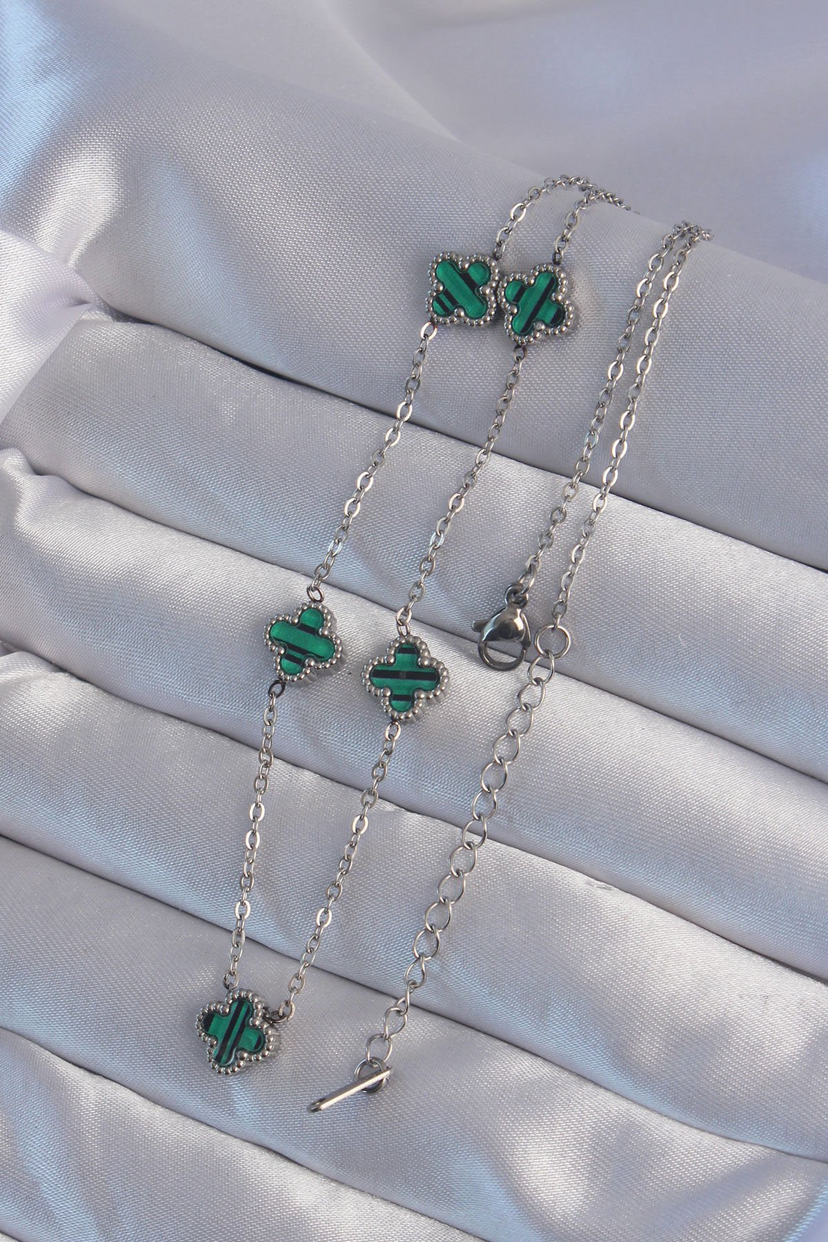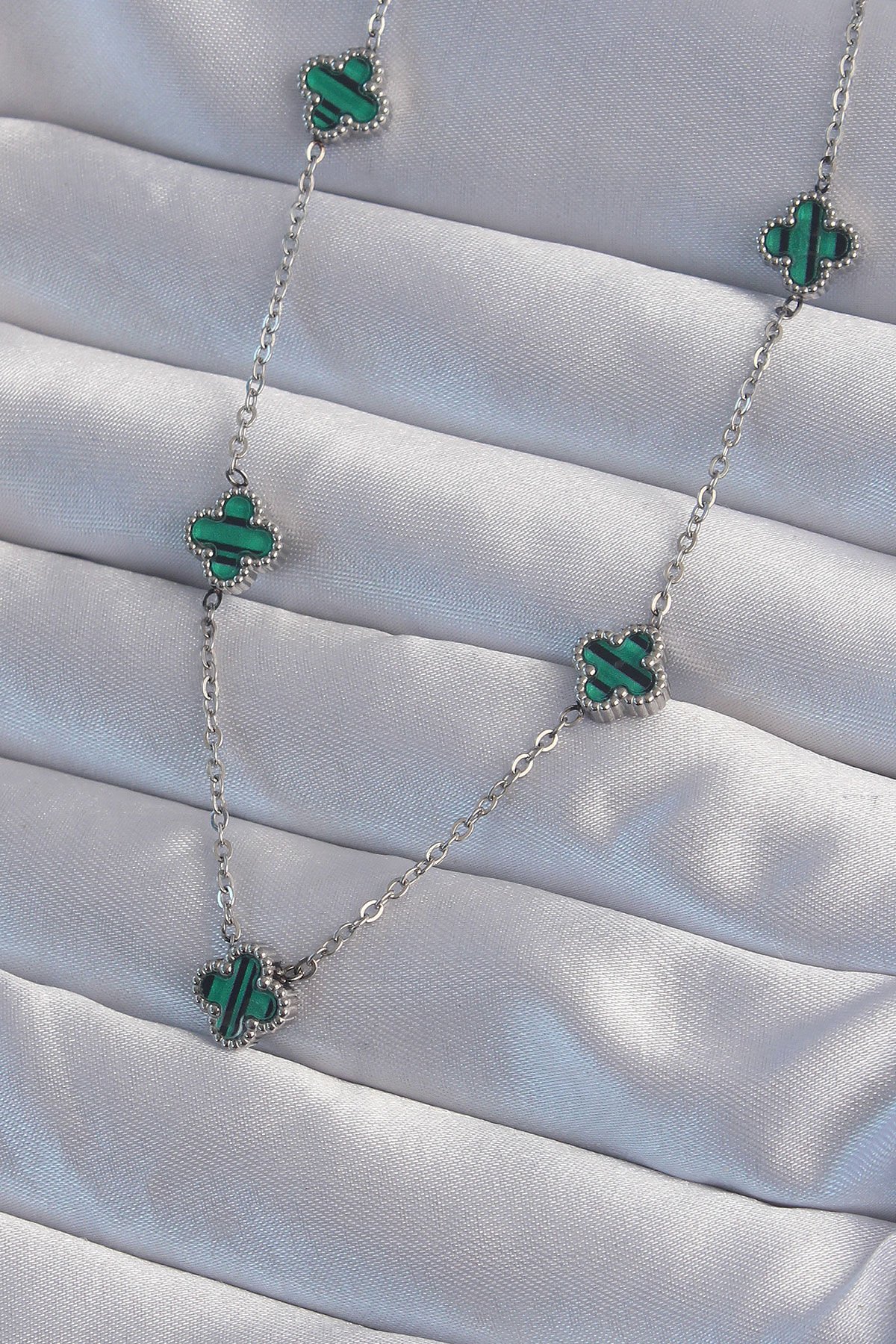 316L Çelik Gümüş Renk Minimal Yeşil Mineli Yonca Kolye e_BKO8999