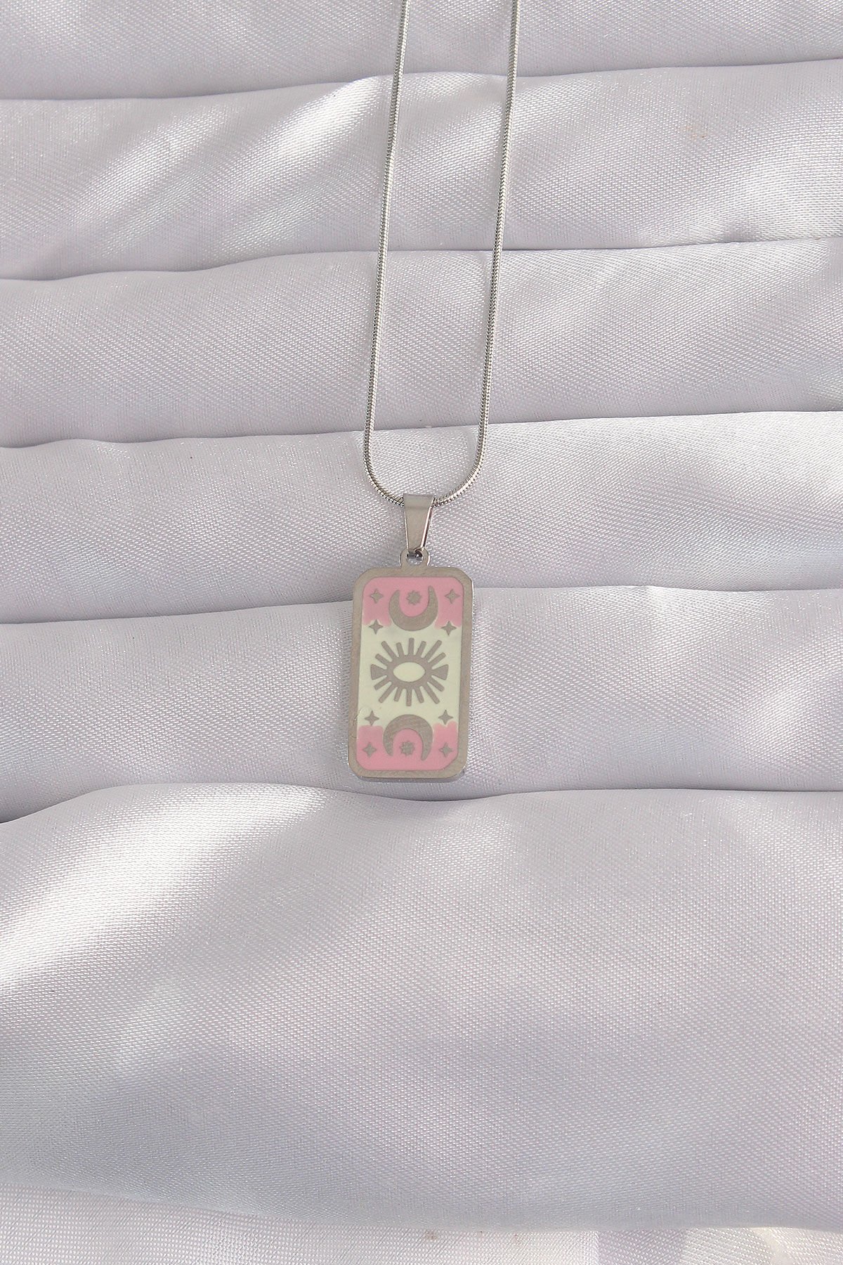 316L Çelik Gümüş Renk Pembe Mineli Ay Figür Tarot Kolye e_BKO9045