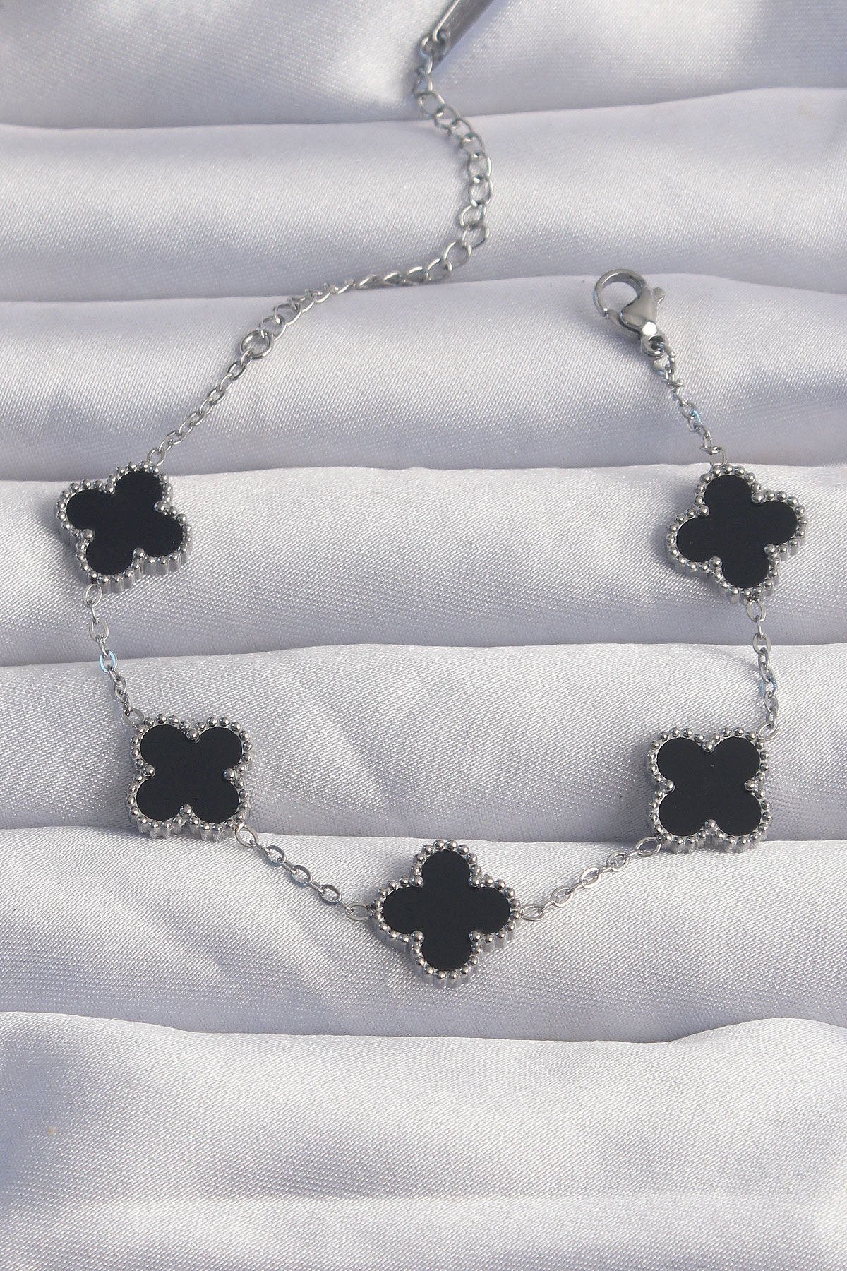 316L Çelik Gümüş Renk Siyah Mineli Yonca Bileklik