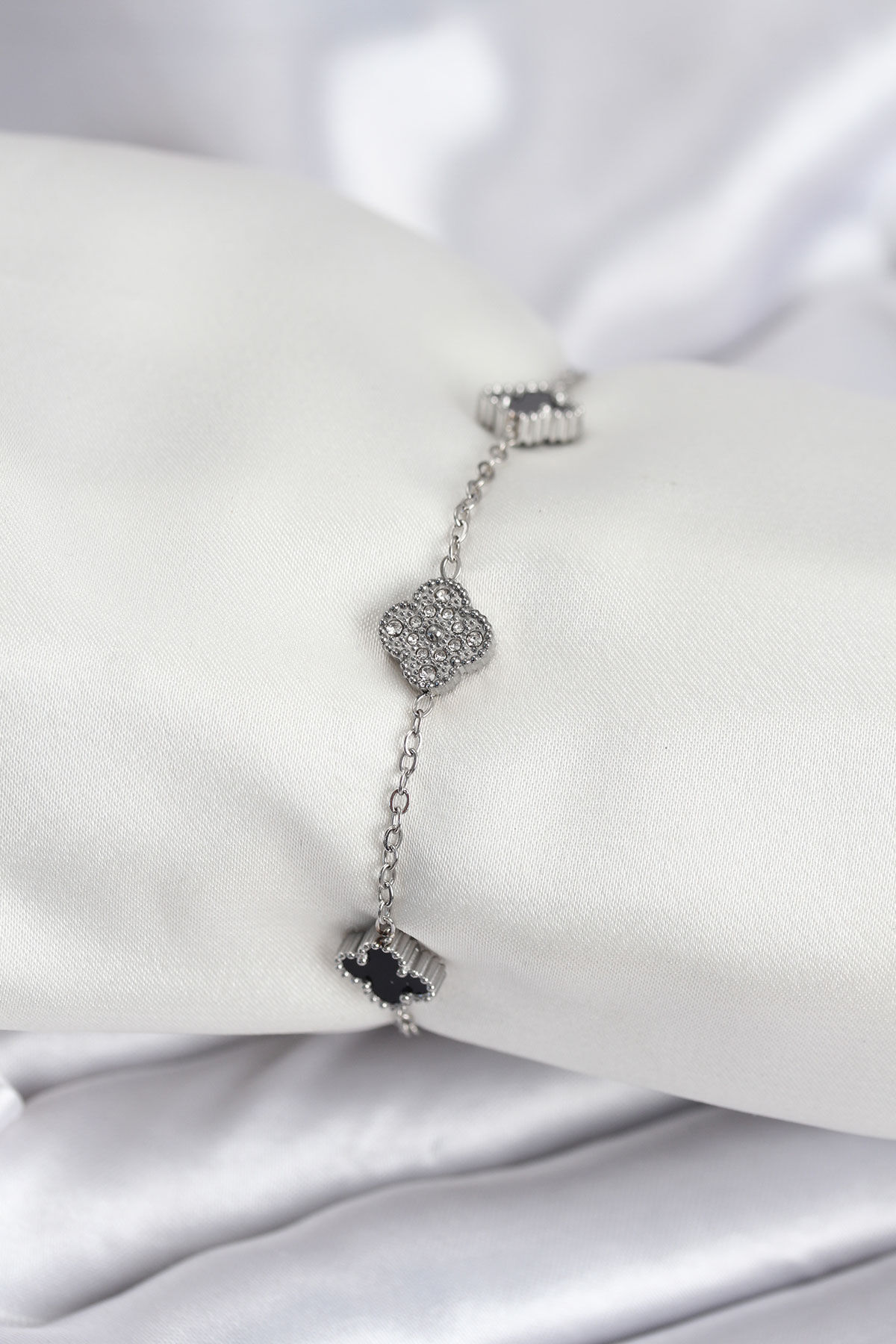 316L Çelik Gümüş Renk Siyah ve Zirkon Taşlı Baby Boy Yonca Kadın Bileklik