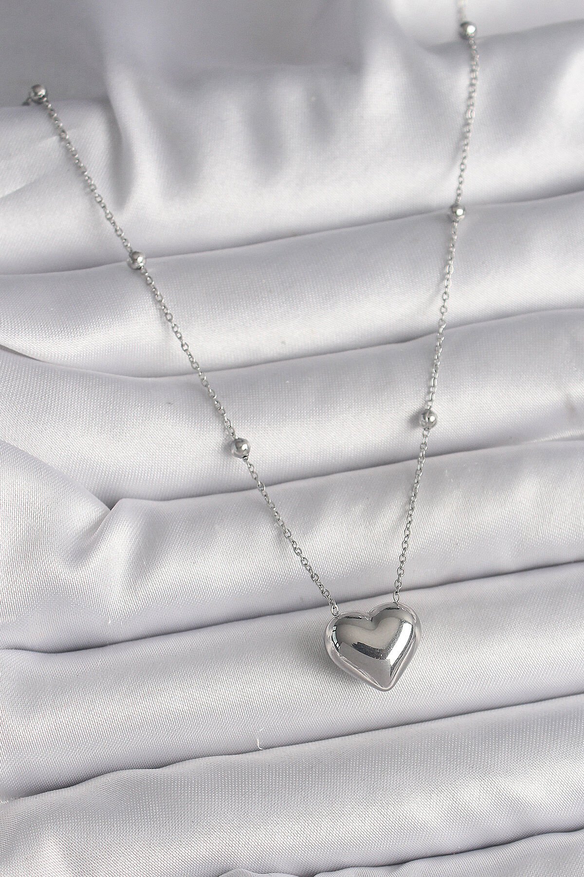316L Çelik Gümüş Renk Topçuk Detay Zincir Kalp Model Kadın Kolye