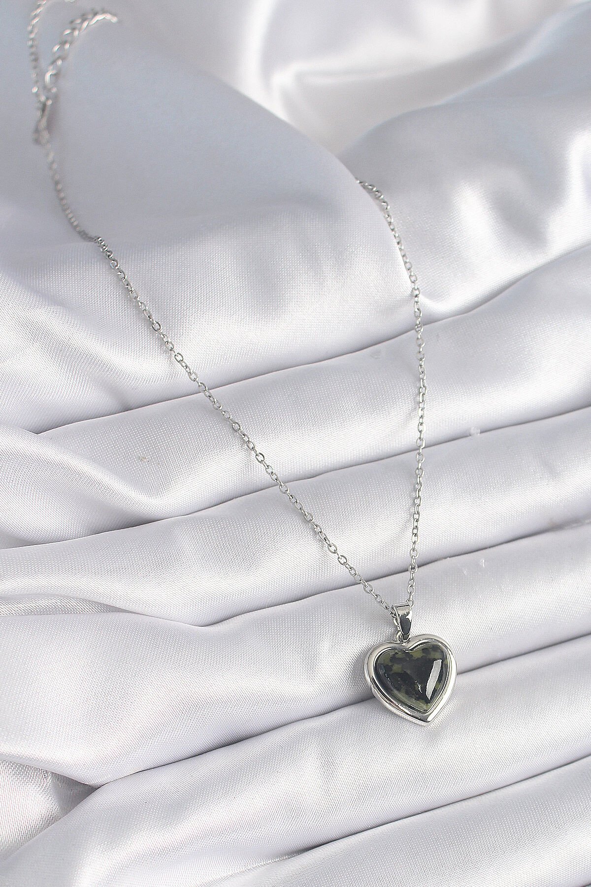 316L Çelik Gümüş Renk Yeşil Mineli Kalp Model Kadın Kolye