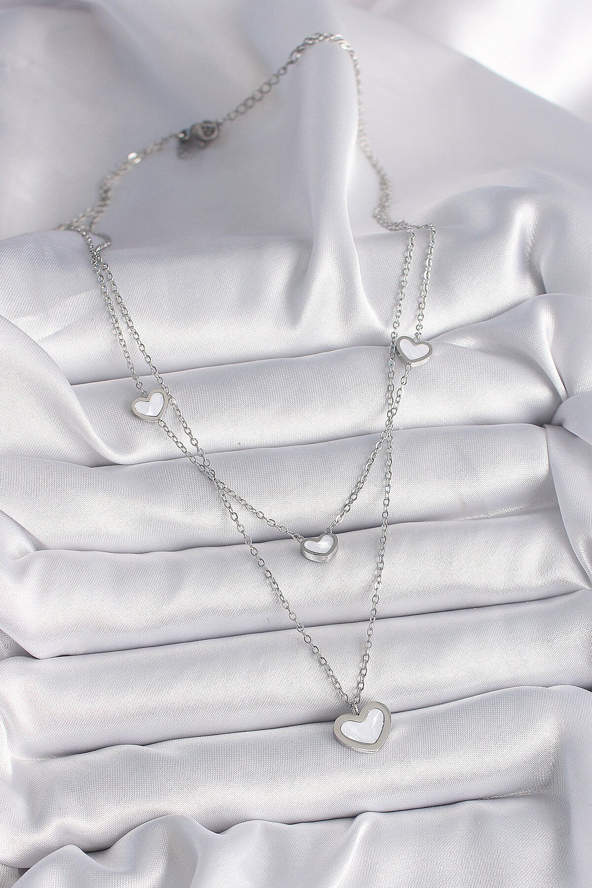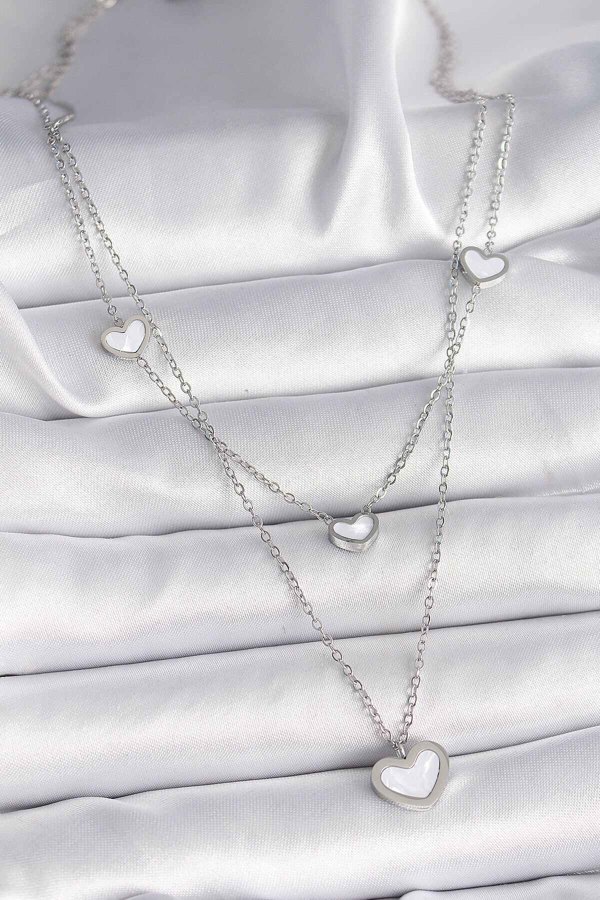 316L Çelik Gümüş Renk Zincir 2'Li Zincir Kalp Model Kadın Kolye