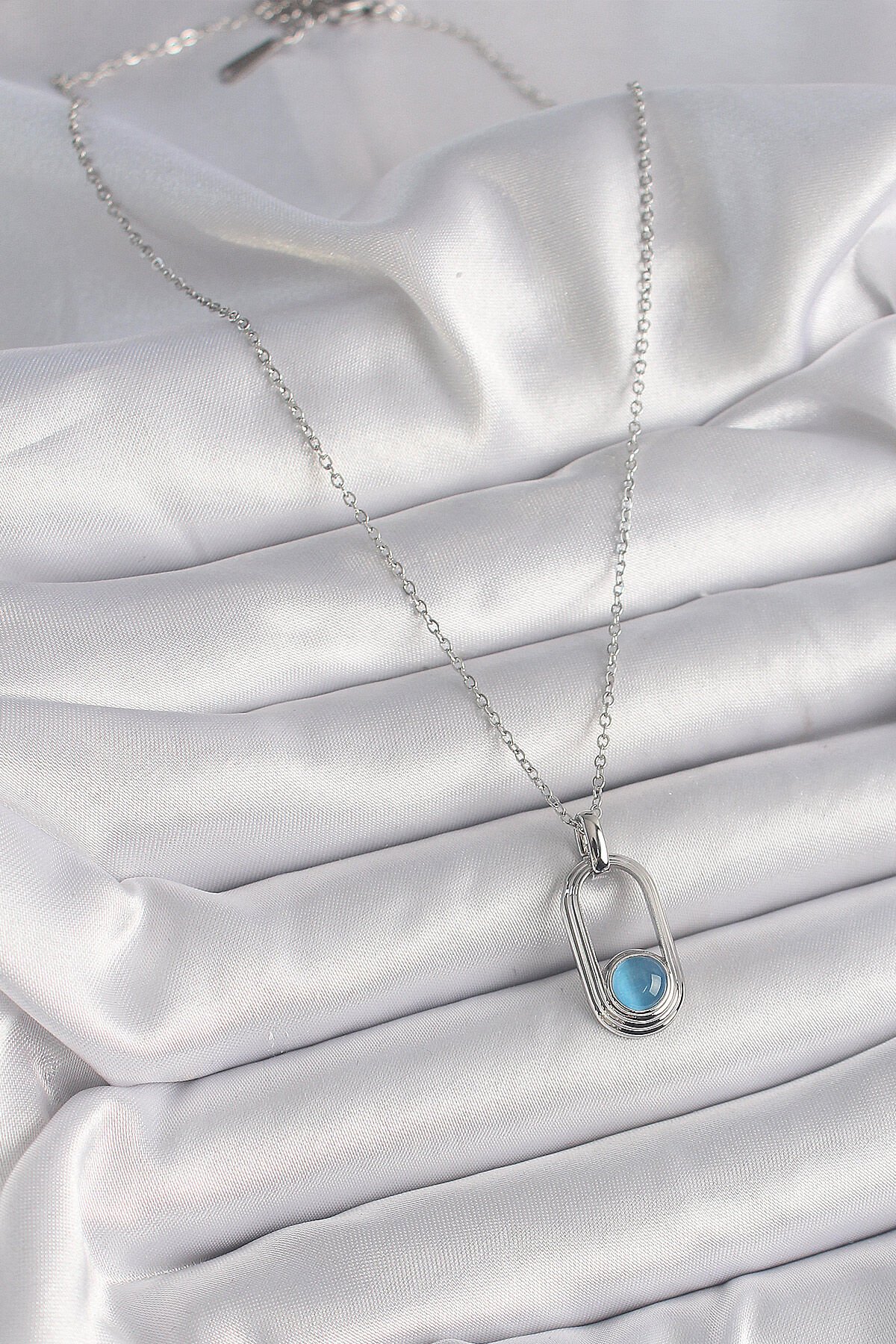 316L Çelik Gümüş Renk Zincir Mavi Kedi Göz Model Kadın Kolye e_BKO9613