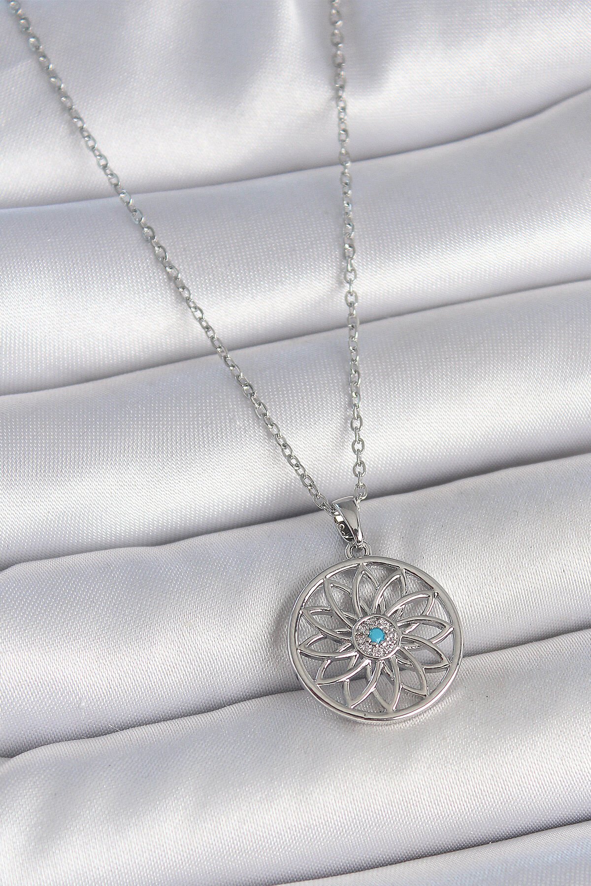 316L Çelik Gümüş Renk Zincir Mavi Taşlı Lotus Model Kadın Kolye