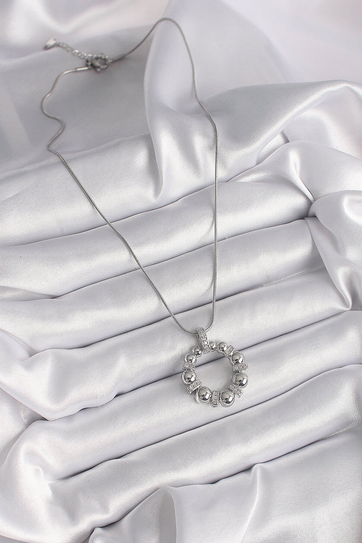 316L Çelik Gümüş Renk Zincir Zirkon Taş Detaylı Bombeli Halka Model Kadın Kolye