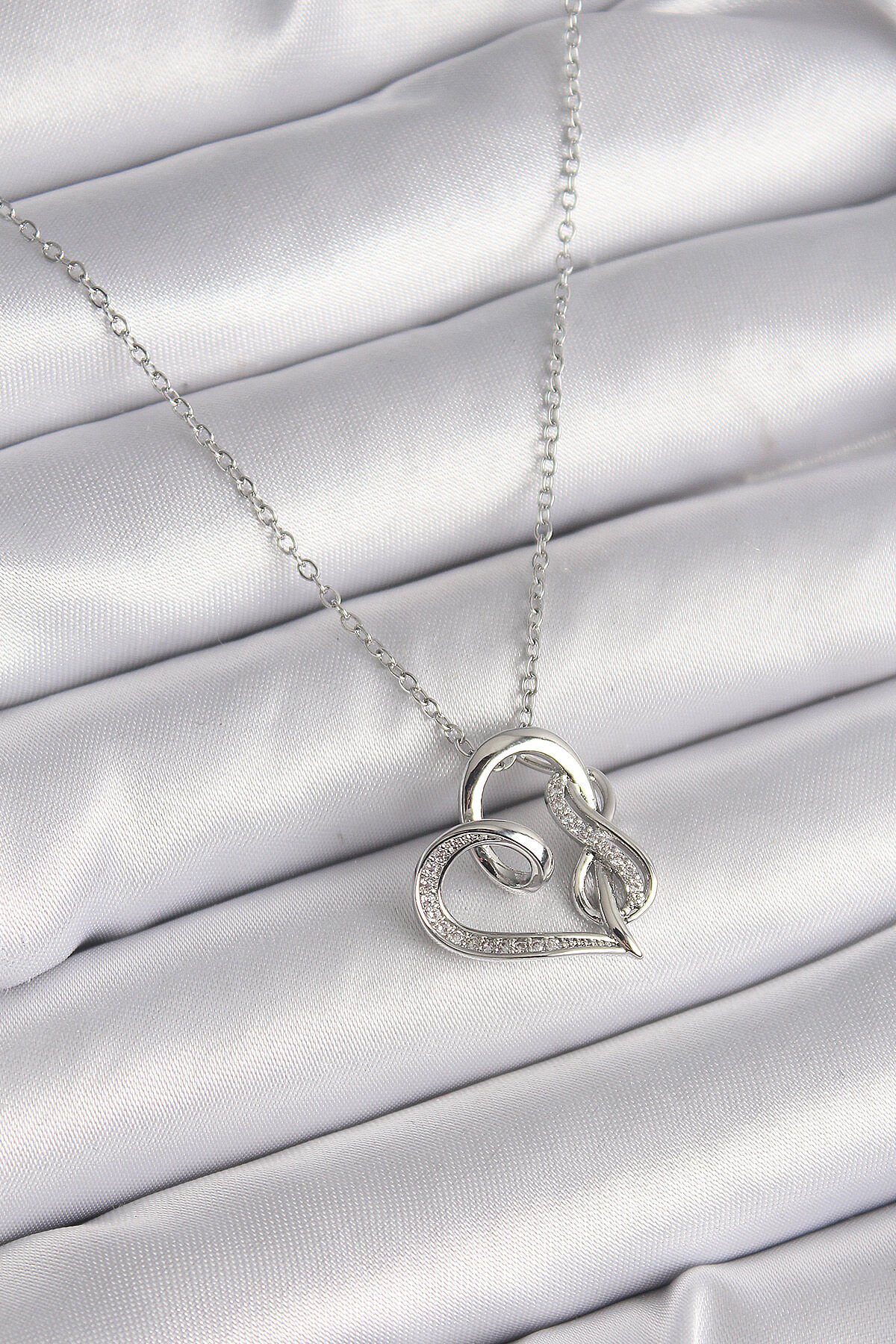 316L Çelik Gümüş Renk Zincir Zirkon Taş Detaylı Kalp Model Sonsuzluk Detay Kadın Kolye