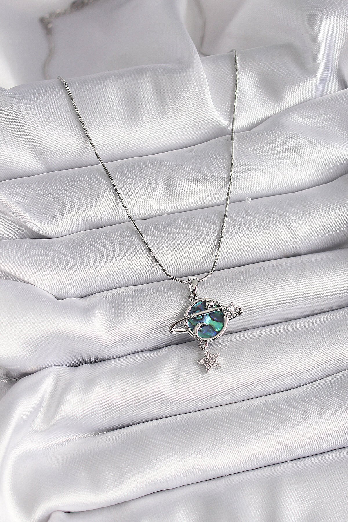 316L Çelik Gümüş Renk Zincir Zirkon Taşlı Gezegen Model Kadın Kolye