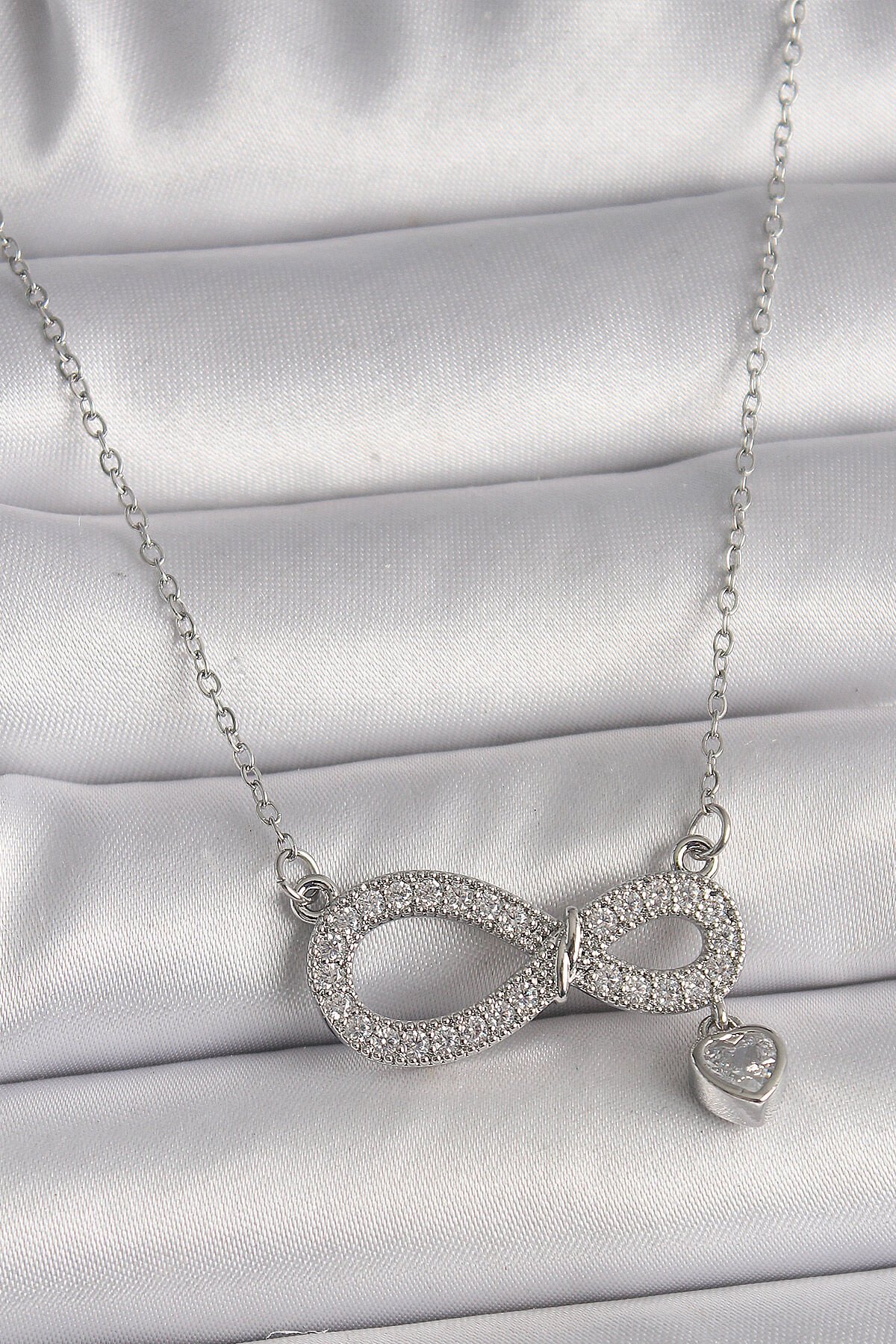 316L Çelik Gümüş Renk Zincir Zirkon Taşlı Sonsuzluk Model Taşlı Kalp Detay Kadın Kolye