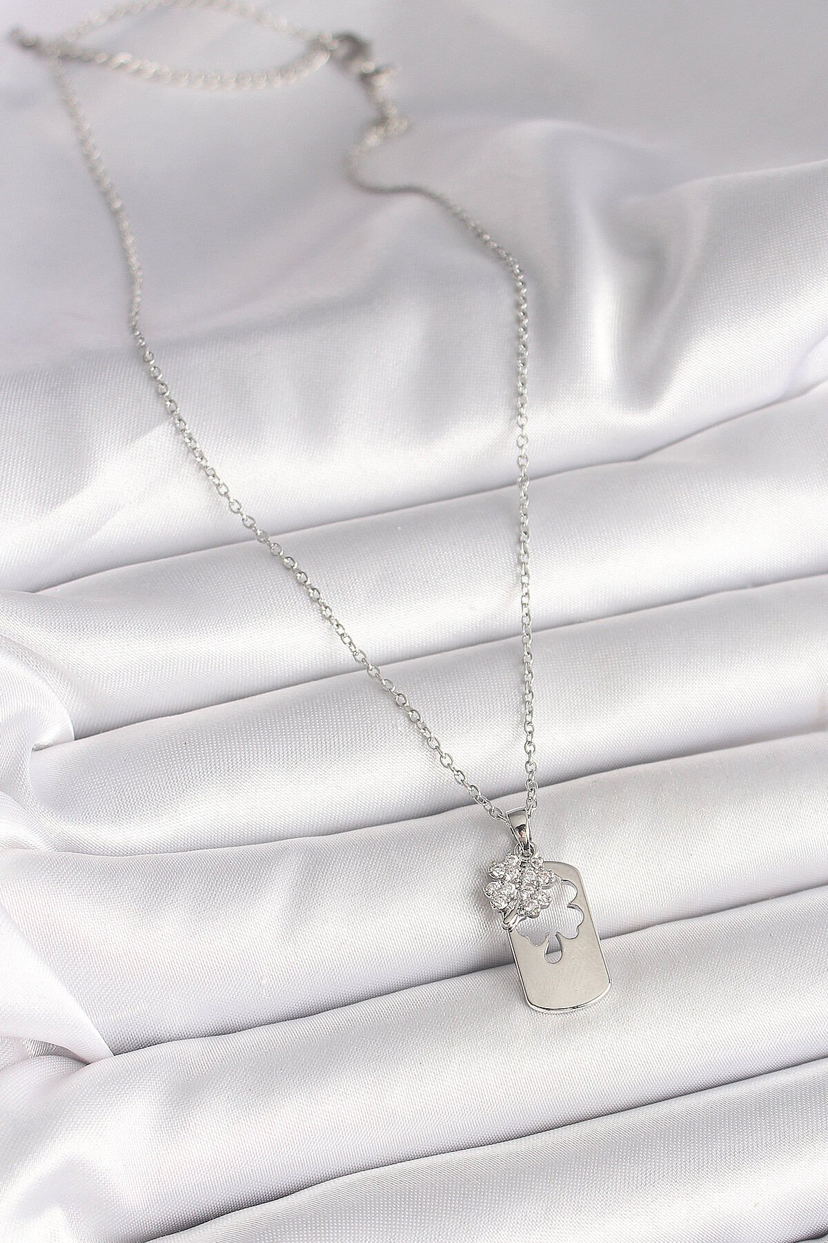 316L Çelik Gümüş Renk Zincir Zirkon Taşlı Yonca Model Kadın Kolye e_BKO9955