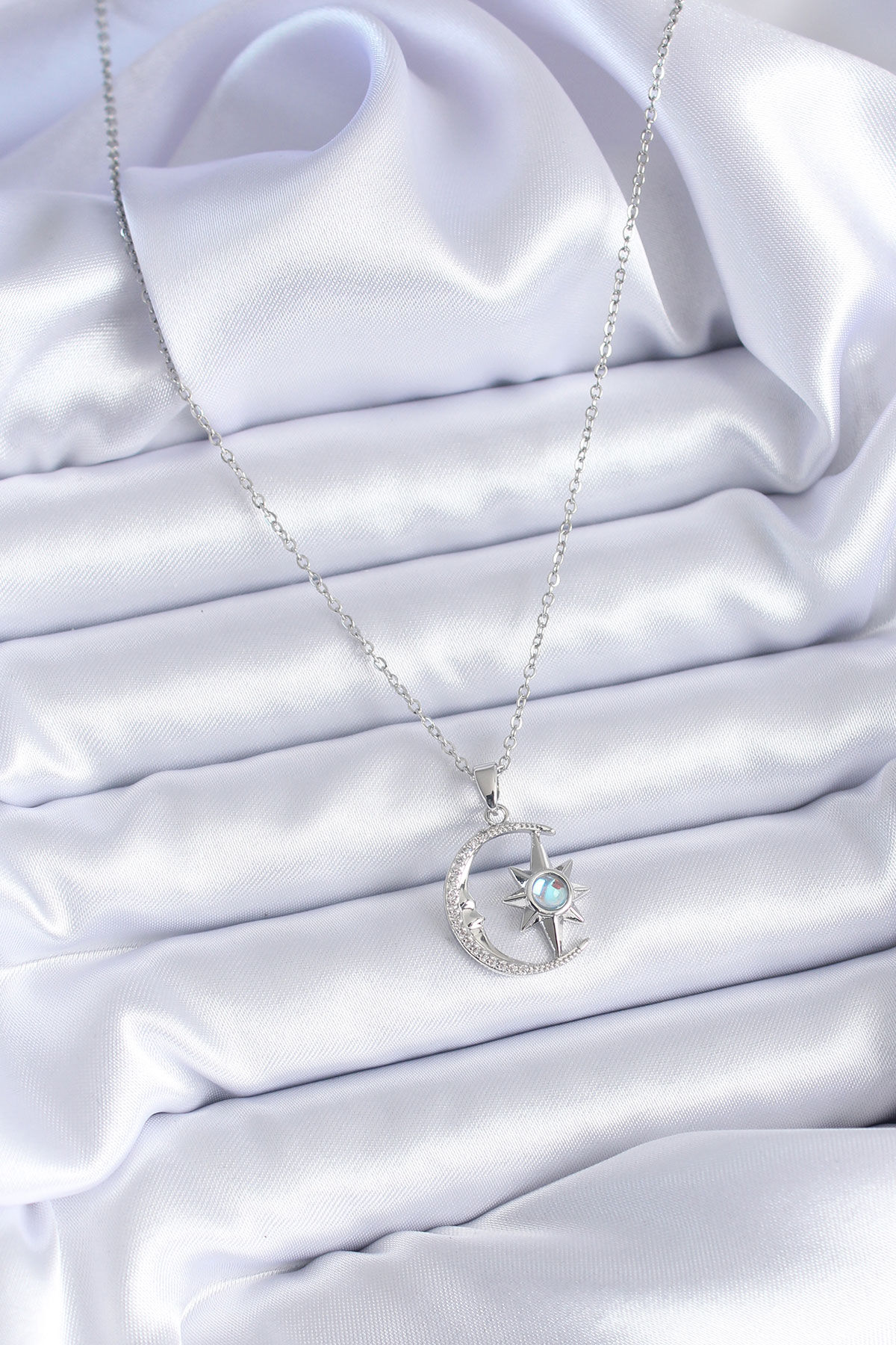 316L Çelik Gümüş Renk Zirkon Taşlı Ay Yıldız Model Kadın Kolye