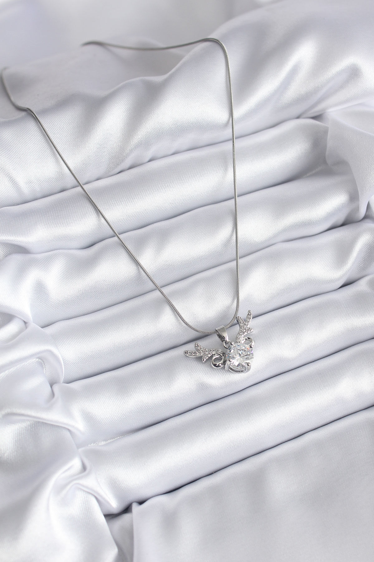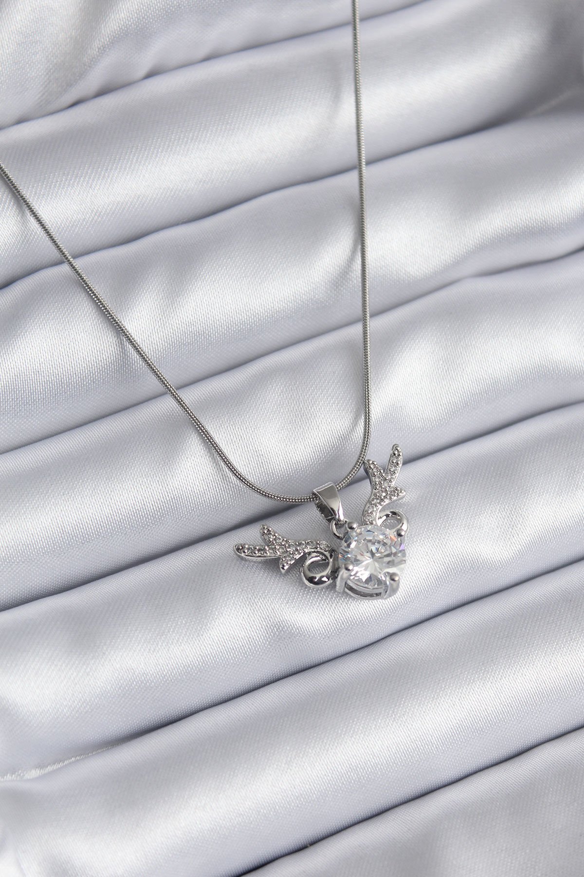 316L Çelik Gümüş Renk Zirkon Taşlı Boynuz Model Kadın Kolye