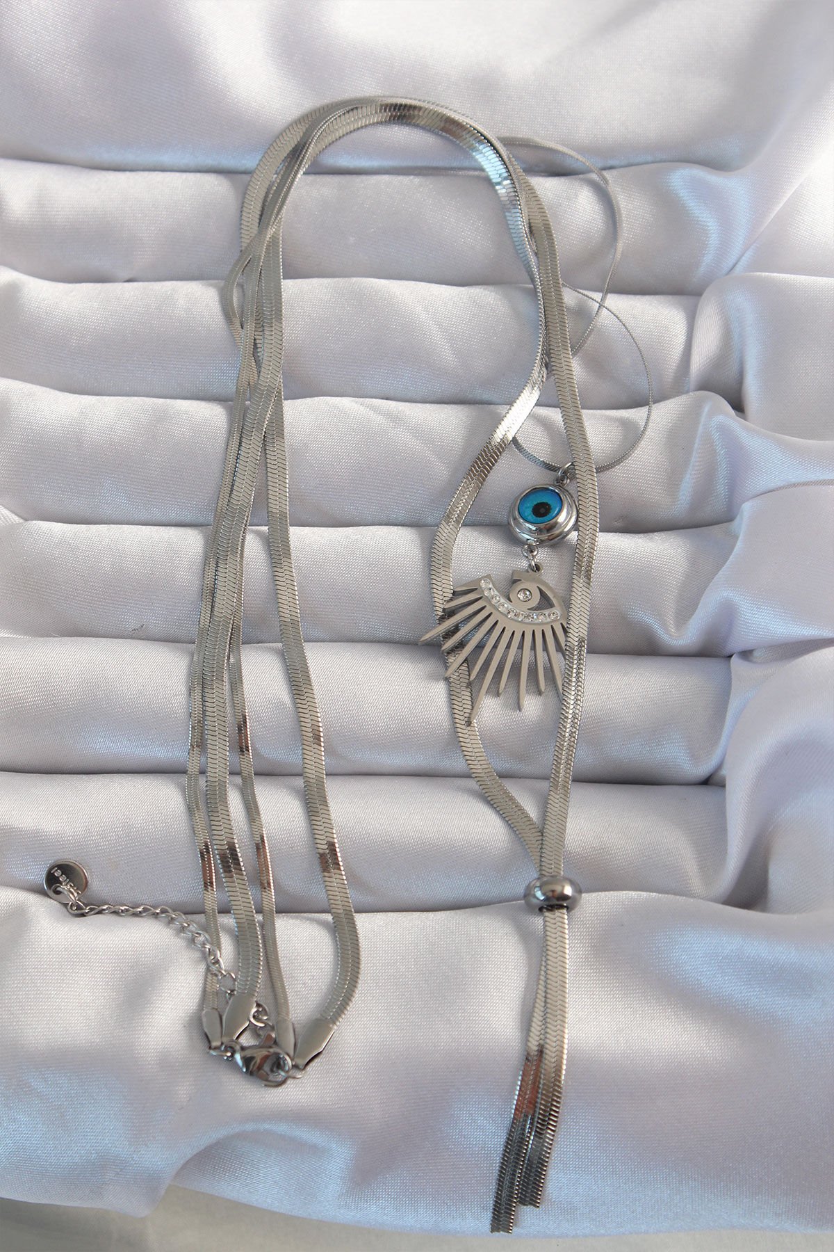 316L Çelik Gümüş Renk Zirkon Taşlı Göz Detay Nazarlı Uzun Asansör Model Kolye