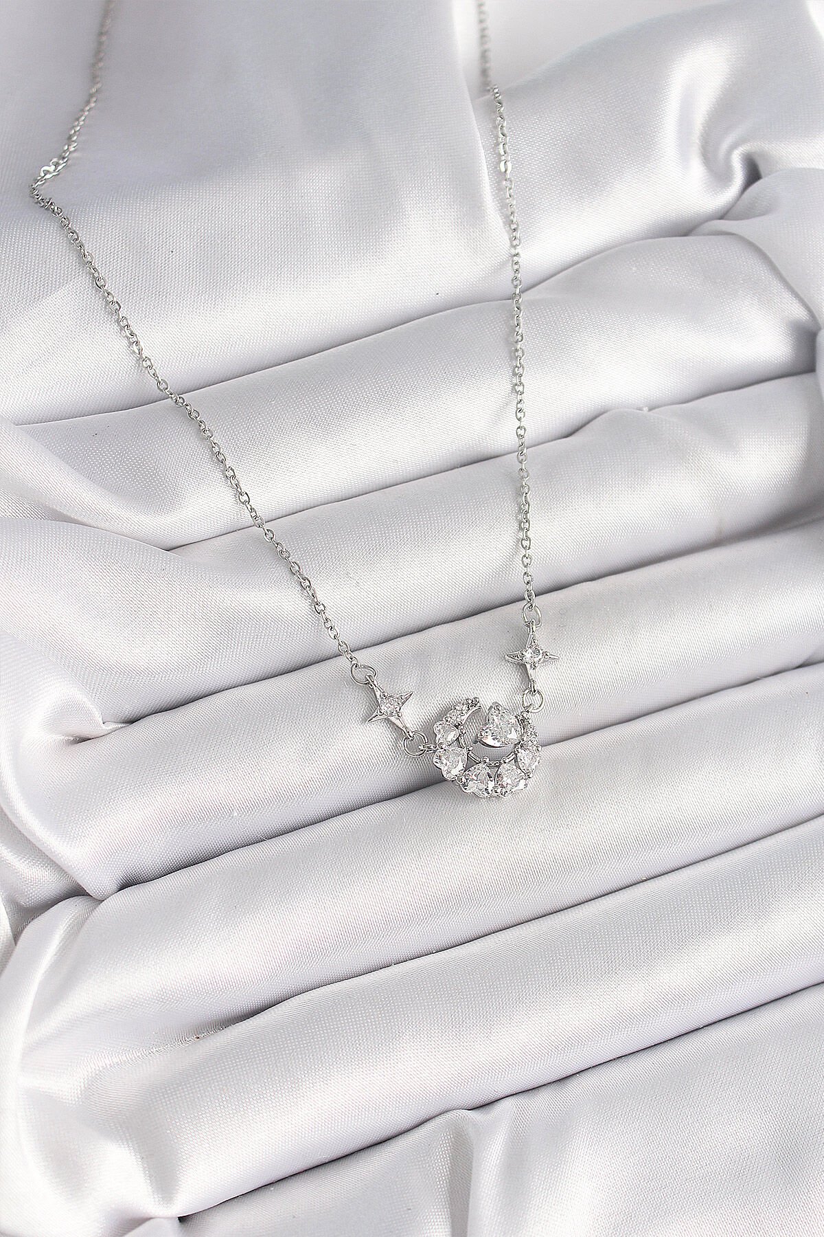 316L Çelik Gümüş Renk Zirkon Taşlı Hilal Kalp Model Kadın Kolye