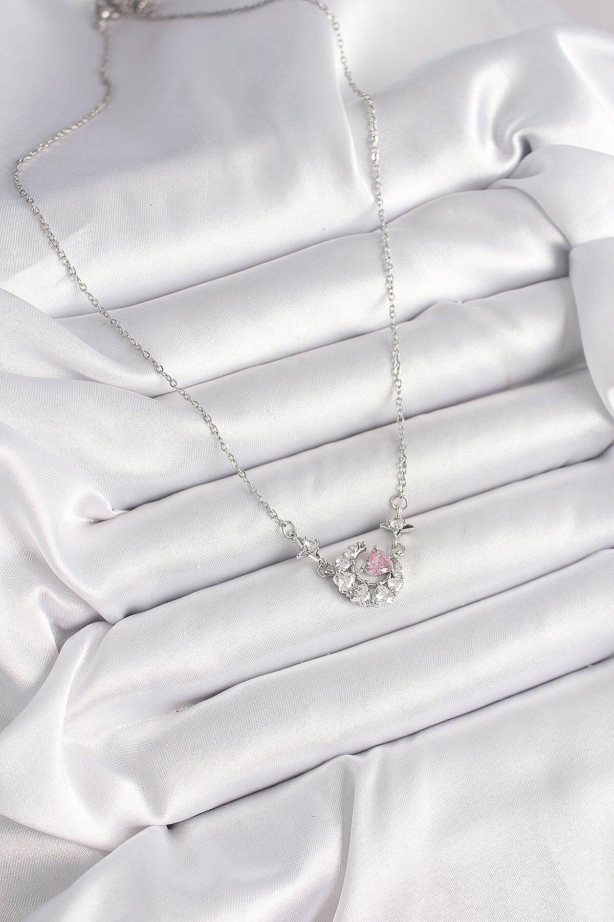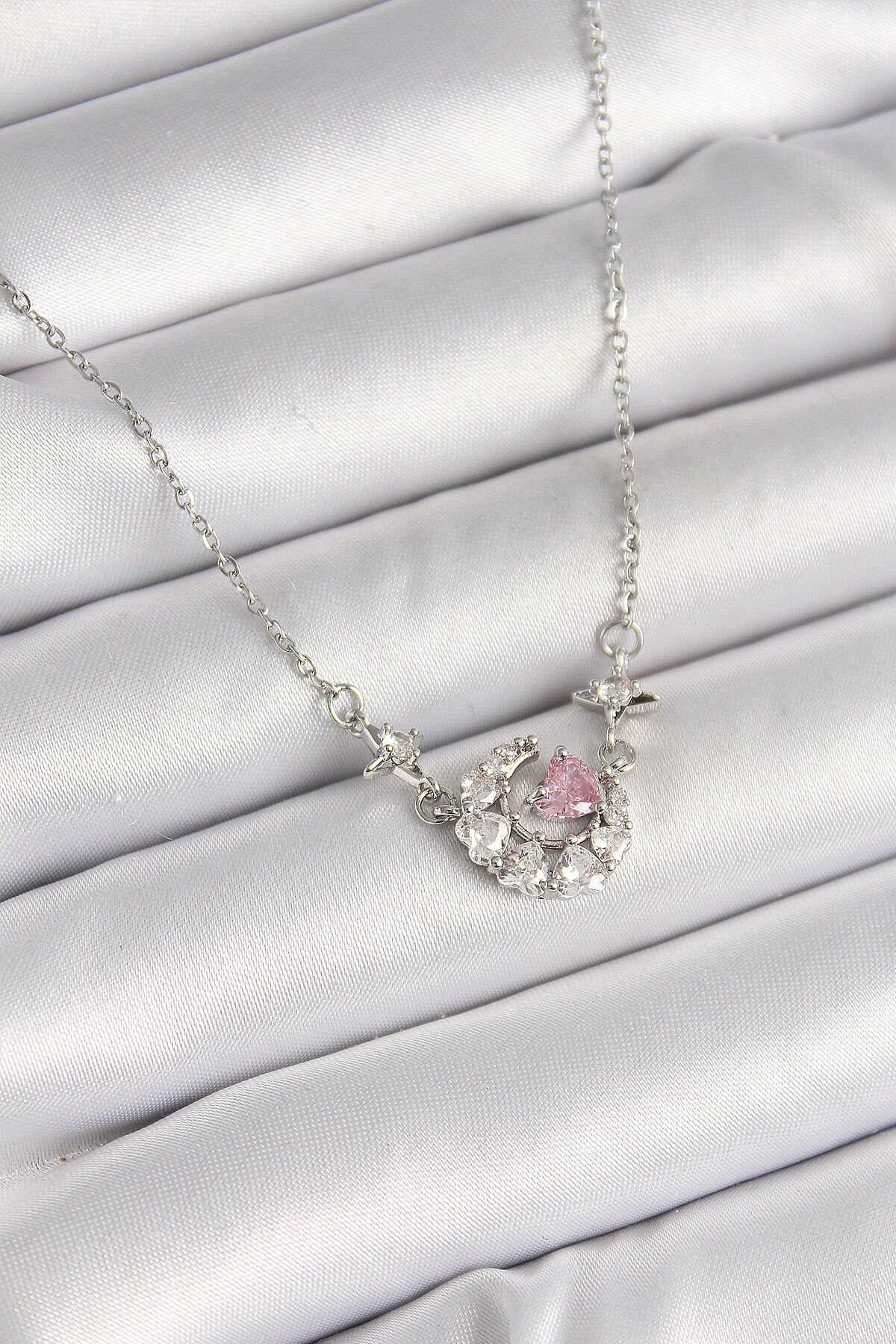 316L Çelik Gümüş Renk Zirkon Taşlı Hilal Pembe Kalp Model Kadın Kolye