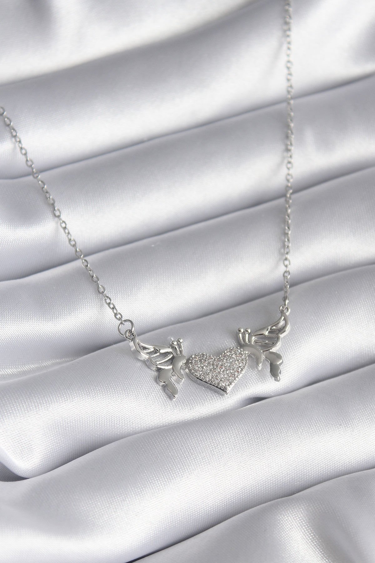 316L Çelik Gümüş Renk Zirkon Taşlı Kanat Kalp Model Kadın Kolye e_BKO8289