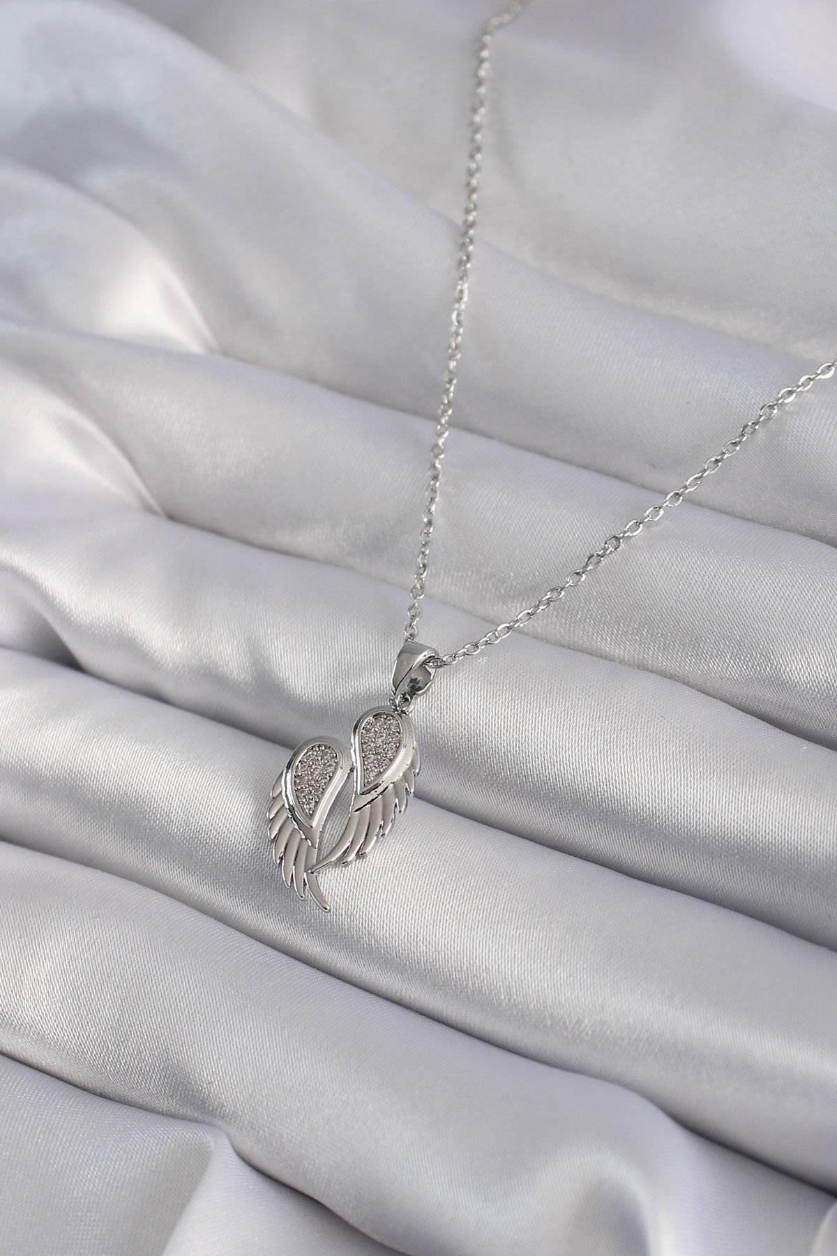 316L Çelik Gümüş Renk Zirkon Taşlı Kanat Model Kadın Kolye e_BKO8347