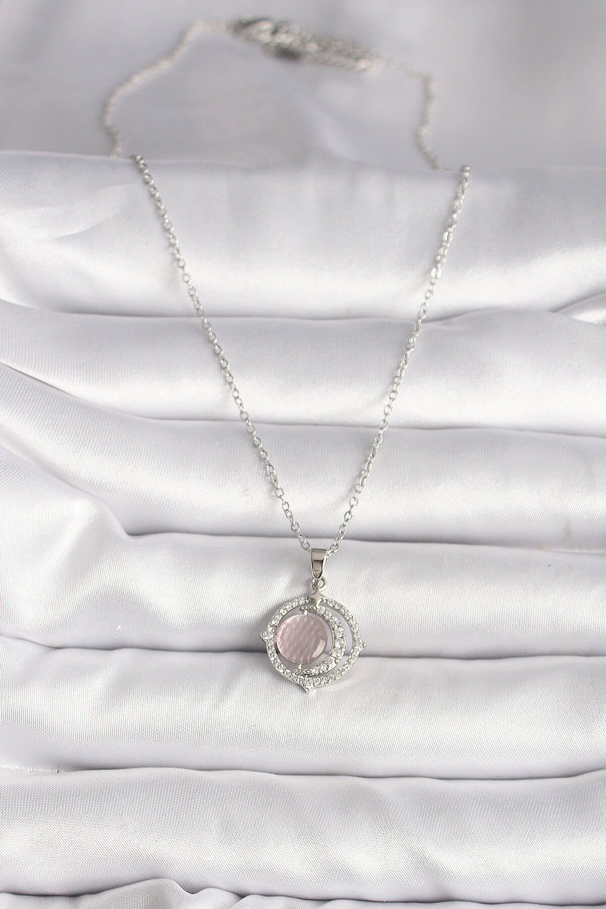 316L Çelik Gümüş Renk Zirkon Taşlı Pembe Sedefli Hilal Model Kadın Kolye